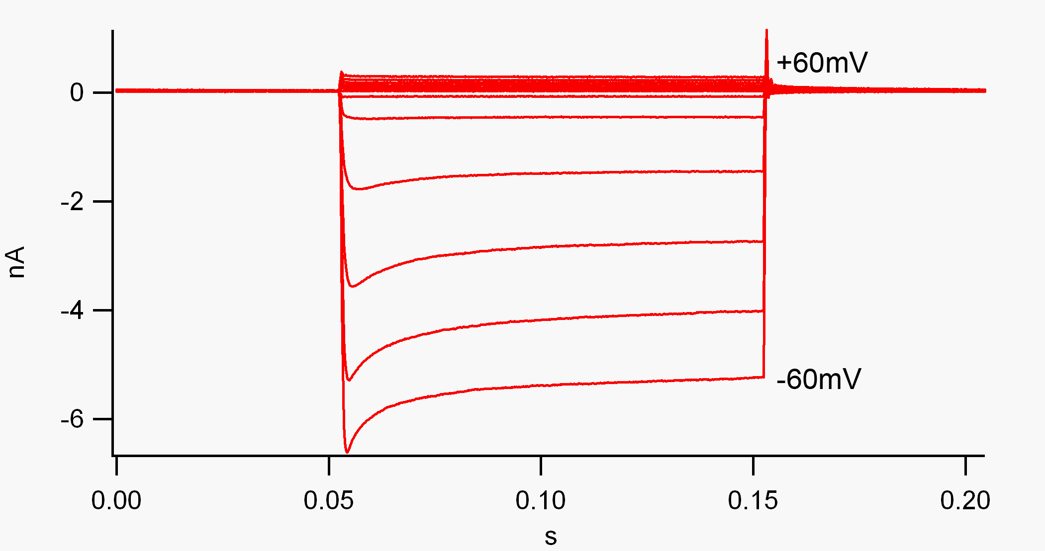 전압 고정 실험에서 내향 전류(양전하가 세포 안으로 이동)는 아래쪽으로 처진 형태로, 외향 전류(양전하가 세포 밖으로 이동)는 위쪽으로 처진 형태로 나타난다. K+의 반전 전위보다 막 전위가 낮을 때, Kir 채널은 K+ 이온을 세포 안으로 들여보내 막 전위를 안정 전위로 되돌린다. (그림 1 참조) 막 전위가 Kir 채널의 안정 전위보다 낮게 고정되면 내향 전류가 흐르지만, 안정 전위보다 높게 설정되면 Kir 채널은 전류를 거의 통과시키지 않는다.