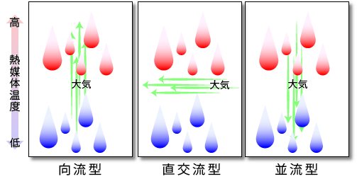 - 직교류형: 대기와 열매체가 직교하도록 흐르는 것으로, 다수를 나란히 설치하는 것이 가능하다. 효율은 향류형보다 떨어진다.