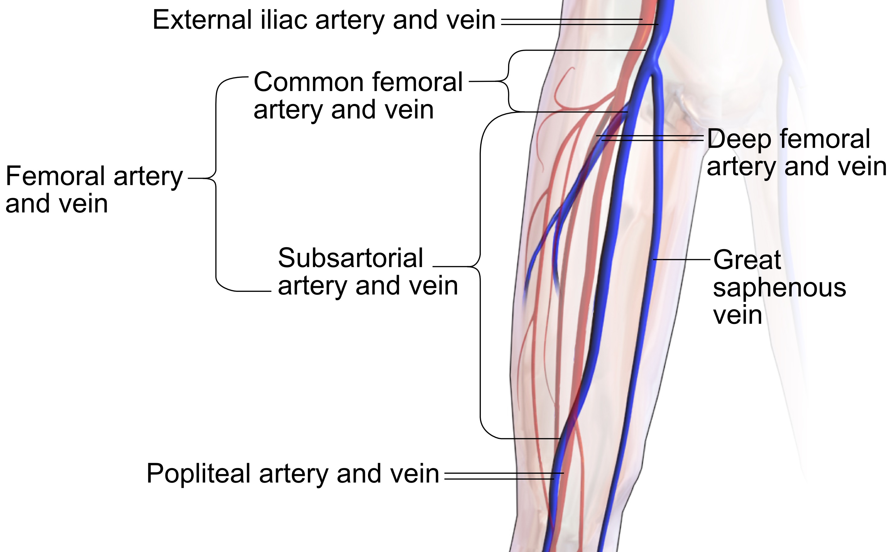 허벅지의 심부 정맥계는 대퇴정맥(넙다리정맥), 총대퇴정맥(온넙다리정맥), 심대퇴정맥(깊은넙다리정맥), 슬와정맥(오금정맥)의 근위부 및 다양한 작은 혈관들로 구성되며, 근위부 심부정맥혈전증이 발생할 수 있다. 관통정맥은 심부 정맥계와 표재 정맥계를 연결하는데, 표재 정맥계는 소복재정맥(작은두렁정맥)과 대복재정맥(큰두렁정맥)으로 구성된다(하지정맥류의 부위).[7]