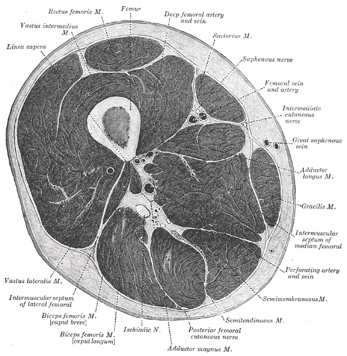 대퇴의 근막구획 문서를 참고하십시오.넓적다리는 가로로 자른 면에서 근막으로 나뉘는 세 개의 구획으로 나뉜다. 이 구획들은 넙다리뼈를 축으로 하며, 질긴 결합 조직 막(또는 사이막)으로 분리된다. 각 구획은 고유한 혈관과 신경을 가지며, 서로 다른 근육 무리를 포함한다.