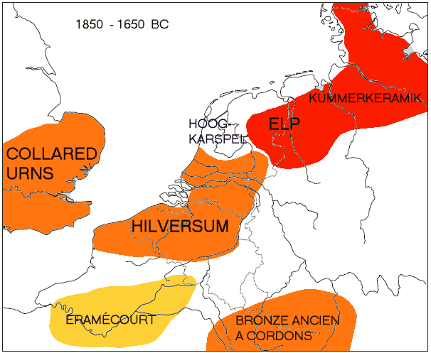 기원전 2950년경 깔때기 비커 문화에서 끈토기 문화로 전환되었다. 끈토기 문화는 북부 및 중부 유럽 대부분 지역으로 확장되었다. 이러한 문화 확장은 인도유럽어족과 구리 시대 기술을 가져온, 우크라이나 방향에서 온 사람들의 이동과 관련이 있는 것으로 여겨진다.[7]2. 5. 엘프 문화와 힐베르쉼 문화