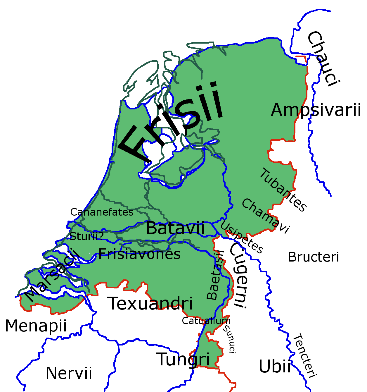 율리우스 카이사르는 갈리아 전쟁 동안 라인강 남쪽의 네덜란드를 포함한 갈리아 전체를 로마를 위해 정복했다. 그는 자신의 경험을 저서 ''갈리아 전기''에 기록했는데, 이는 이 지역에 대한 최초의 현존하는 기록이다.[17] 카이사르는 강 삼각주에 거주하는 메나피와 현재 림부르크로 향하는 그들의 남동쪽에 있는 에부로네스를 언급했다. 그는 라인강과 발강 사이의 땅을 "바타비의 섬"(''insula batavorum'')이라고 불렀다. 그는 라인강을 갈리아인과 강 건너편의 게르만족 사이의 자연 경계로 묘사했지만, 에부로네스족과 같은 사람들이 강 건너편의 이웃과 친족 관계를 맺고 있다는 것을 알고 있었다.[17]타키투스와 대 플리니우스와 같은 후기 로마 작가들은 라인강 북쪽 지역에 프리시족, 카마비족, 투반테스족이 거주했다고 묘사했다. 삼각주 안에는 카나네파테스족, 바타비족, 스투리족, 마르사키족, 프리시아보네스족이 살았다. 텍수안드리족, 베타시족, 퉁그리족은 삼각주 남쪽에 살았다.[17]