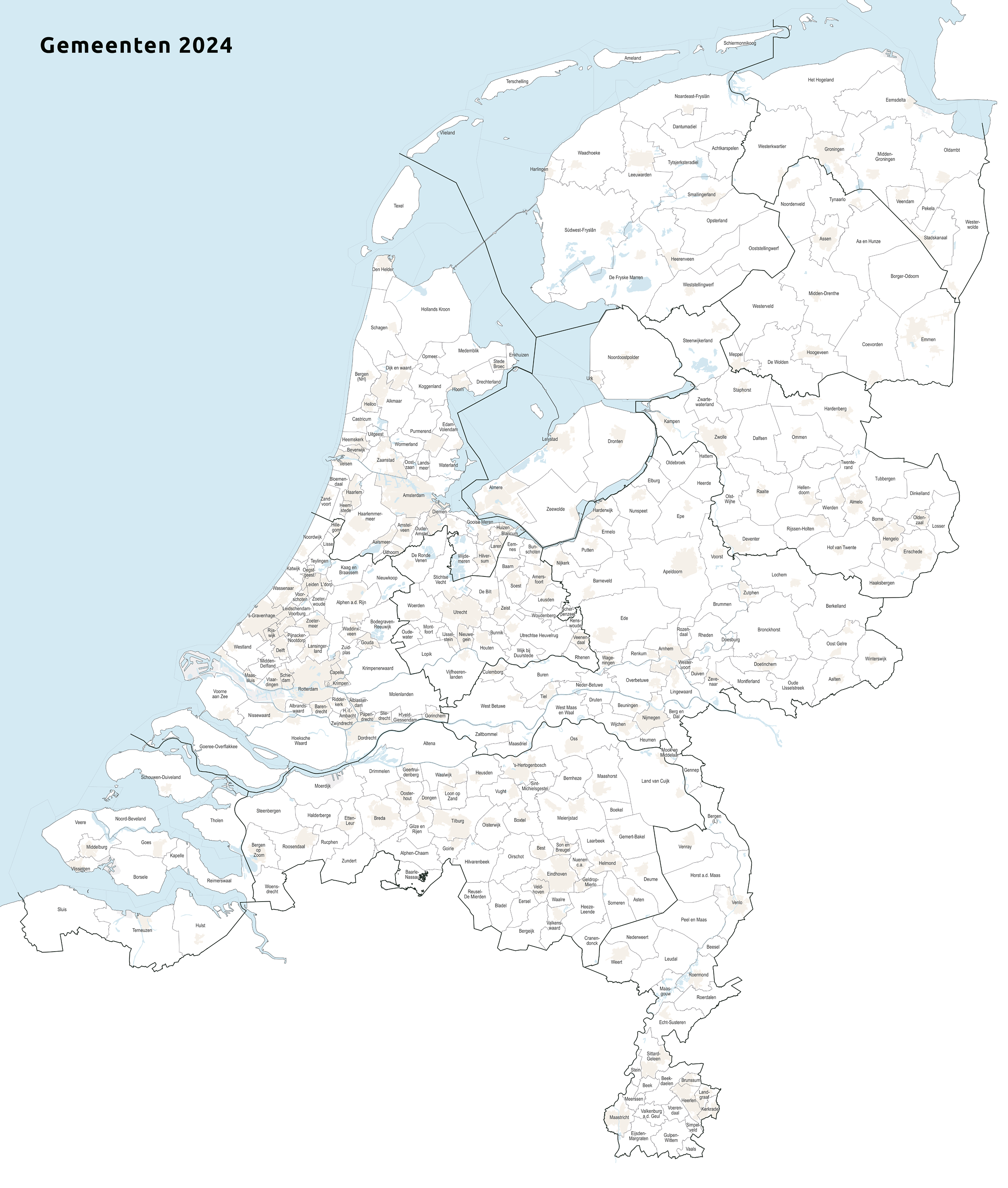 네덜란드는 19세기 중반 최초의 공식 경계가 설정된 이후 지방 자치체의 합병으로 그 수가 3분의 2로 줄었다. 2023년 1월 1일 기준으로 342개의 지방 자치체(gemeenten)가 있으며, 이들은 네덜란드의 2단계 행정 구역으로, 각각의 주에 속한다. 지방 자치체의 업무는 중앙 정부에 의해 위임되며, 4년마다 선출되는 지방 의회에 의해 통치된다.지방 자치체의 규모는 매우 다양하다. 베스터보르트는 면적이 7.03 km2로 가장 작고, 쥐드베스트프리슬란은 면적이 523.01 km2로 가장 크다. 스히르몬니코흐는 인구 밀도가 23/km2로 가장 적은 지방 자치체이다. 암스테르담은 90만 명이 넘는 주민(2022년 3월 31일 기준)으로 인구가 가장 많고, 헤이그는 인구 밀도가 6620/km2로 가장 높다.