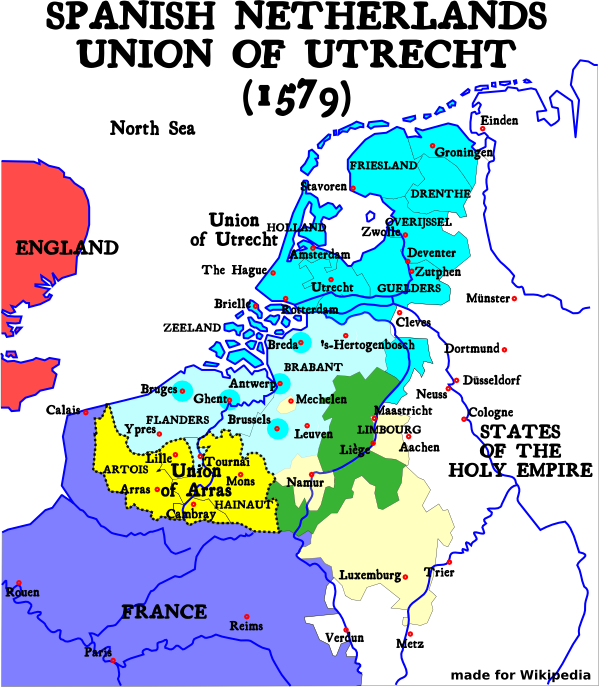 1585년 네덜란드는 개신교 (칼뱅주의)가 대다수인 북부와 로마 가톨릭이 대다수인 남부로 분리되었으며, 북부는 사실상 독립국이 되었고 남부는 여전히 에스파냐의 지배하에 있었다. 에스파냐는 남부에 상당수의 군대를 주둔시켜 북부 네덜란드와 전쟁을 치르는 한편 프랑스를 견제하였다.[41]