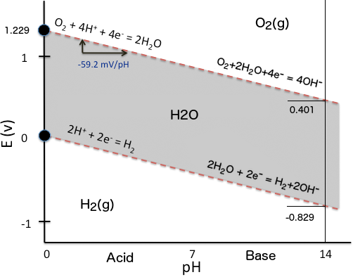 두 선의 기울기는 -59.16 mV/pH 단위로 동일하며, 분극선도에서 평행하다. 높은 pH에서는 수소와 산소 발생에 더 낮은 환원 전위가 필요하다.