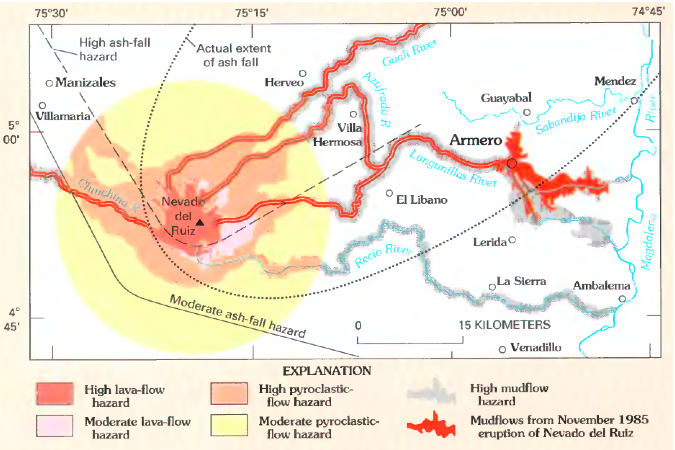 1845년 2월 19일 아침, 대규모 지진으로 상당한 진흙 사태가 발생했다.[26] 이 진흙 사태는 라구나야스 강 계곡을 따라 약 70km 뻗어 내려갔으며,[27] 하천 밖으로 흘러나와 지역 주민 다수를 사망하게 했다.[26] 선상지에 도달한 후 진흙 사태는 두 갈래로 갈라졌다. 더 큰 부분은 라구나야스 강과 합류하여 인근 마그달레나 강으로 흘러갔고, 더 작은 부분은 라구나야스 협곡 앞의 언덕에 의해 방향이 바뀌어 90도 북쪽으로 꺾여 사반디야 강에 도달한 다음 사반디야 강과 함께 동쪽으로 흘러 사반디야와 마그달레나 강이 합류하는 지점에서 진흙 사태의 다른 갈래와 다시 합류했다. 진흙 사태로 인해 약 1,000명이 사망한 것으로 추정된다.[26]3. 3. 1985년 분화 (아르메로 비극)