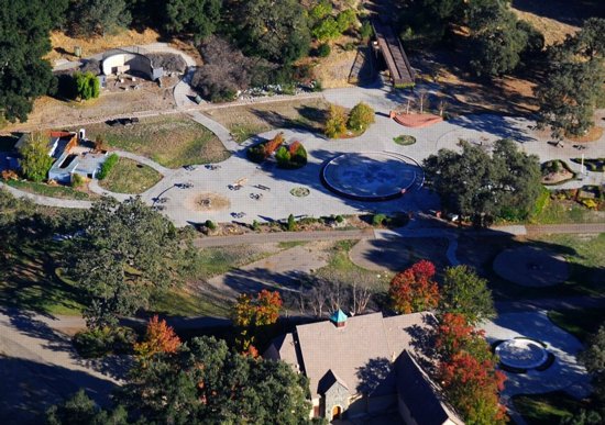 이 부동산은 1981년 부동산 개발업자 윌리엄 본이 매입했을 당시에는 원래 자카 라데라스 목장(Zaca Laderas Ranch)으로 알려졌다.[3] 본은 이 부동산의 이름을 시카모어 밸리 목장(Sycamore Valley Ranch)으로 바꾸고 가족과 함께 이주했다. 본은 건축가 로버트 알테버스를 불러 목장의 주요 건물 설계를 의뢰했고, 두 사람은 2년 반 동안 잠재적인 디자인과 아이디어를 연구했다. 약 1207.74m2 규모의 본채는 1982년 알테버스의 설계에 따라 완공되었으며,[7] 정원, 석교, 4acre 규모의 호수와 약 1.52m 높이의 폭포가 조성되었다. 본은 나중에 이 집을 짓는 과정에서 "15년간 주택 건설을 하면서 배운 모든 것을 표현하고 싶었다... 사업상 하고 싶었지만 할 수 없었던 모든 것을 여기서 이루었다"고 말했다.[8] 그는 이 부동산을 컨트리 클럽으로 개조하는 것을 고려했지만 그렇게 하지 않았다.[9]3. 2. 놀이 시설