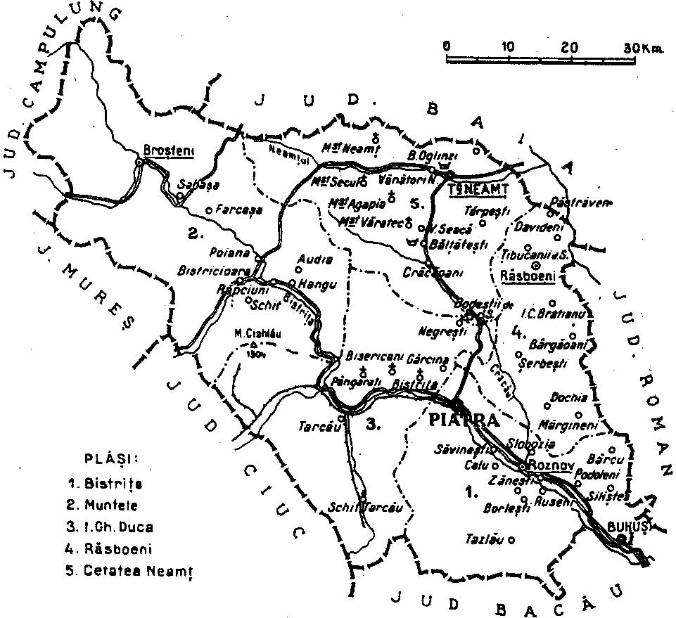 1930년 기준으로 네암츠주는 4개의 지구(plasă|플라서ro, 복수형: plăși|플러시ro)로 구성되었다.[7]