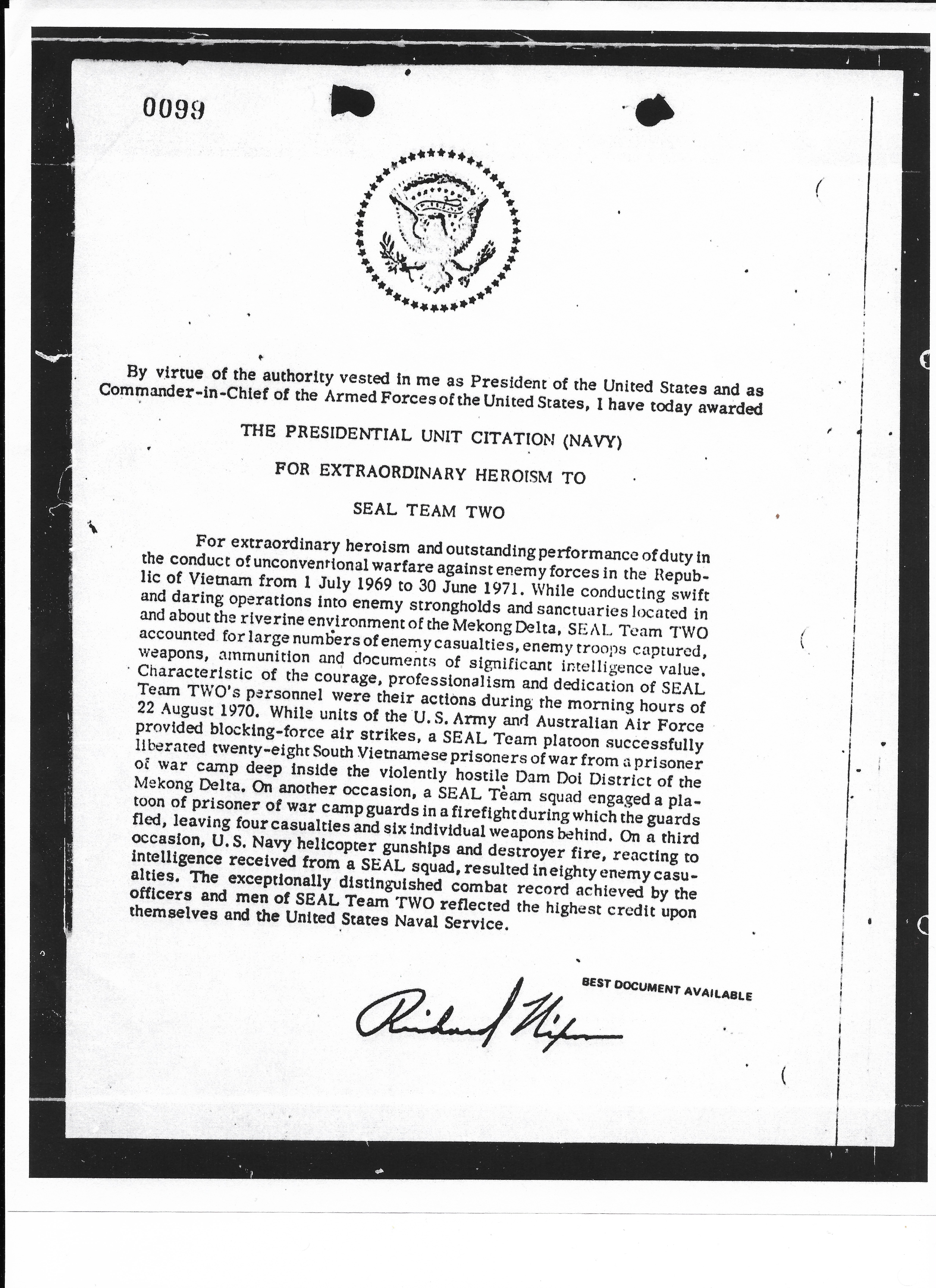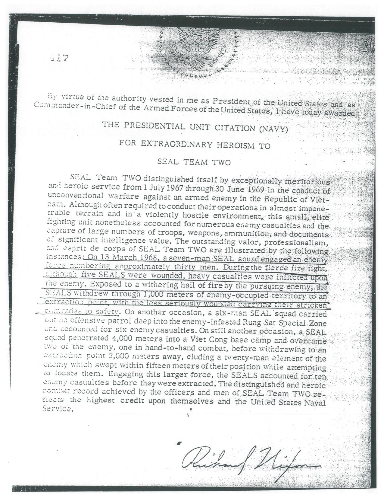 해군은 특수작전 분야에서 해군의 역할을 결정해야 했다. 1961년 3월, 해군 작전 사령관인 아르레이 버크 제독은 게릴라전 및 반게릴라전 부대 설립을 권고했다. 이 부대는 해상, 공중 또는 육상에서 작전을 수행할 수 있도록 설계되었고, 이것이 네이비 실의 시작이었다.[8] 1962년 1월, 기존의 수중폭파대(UDT) 대원들을 주축으로 네이비 실 1팀과 2팀이 창설되었다.[39] 1팀은 캘리포니아 샌디에이고의 코로나도 해군 상륙기지에, 2팀은 버지니아주 버지니아 비치의 리틀 크리크 해군 상륙기지에 배치되었다.[12] 이들은 해양 및 하천 환경에서 반게릴라전과 비밀 작전을 수행하는 임무를 맡았다.[12]
