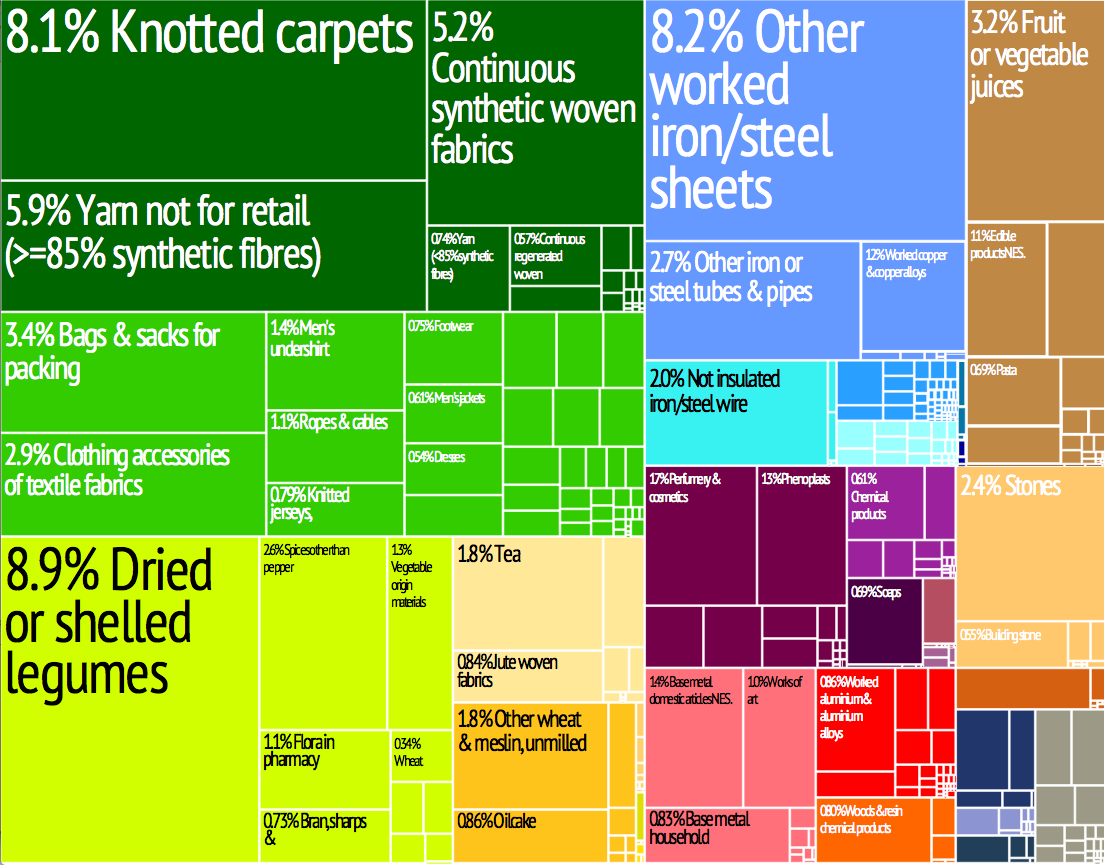 주요 수출품의류, 콩류, 카펫, 섬유, 주스, 황마 제품