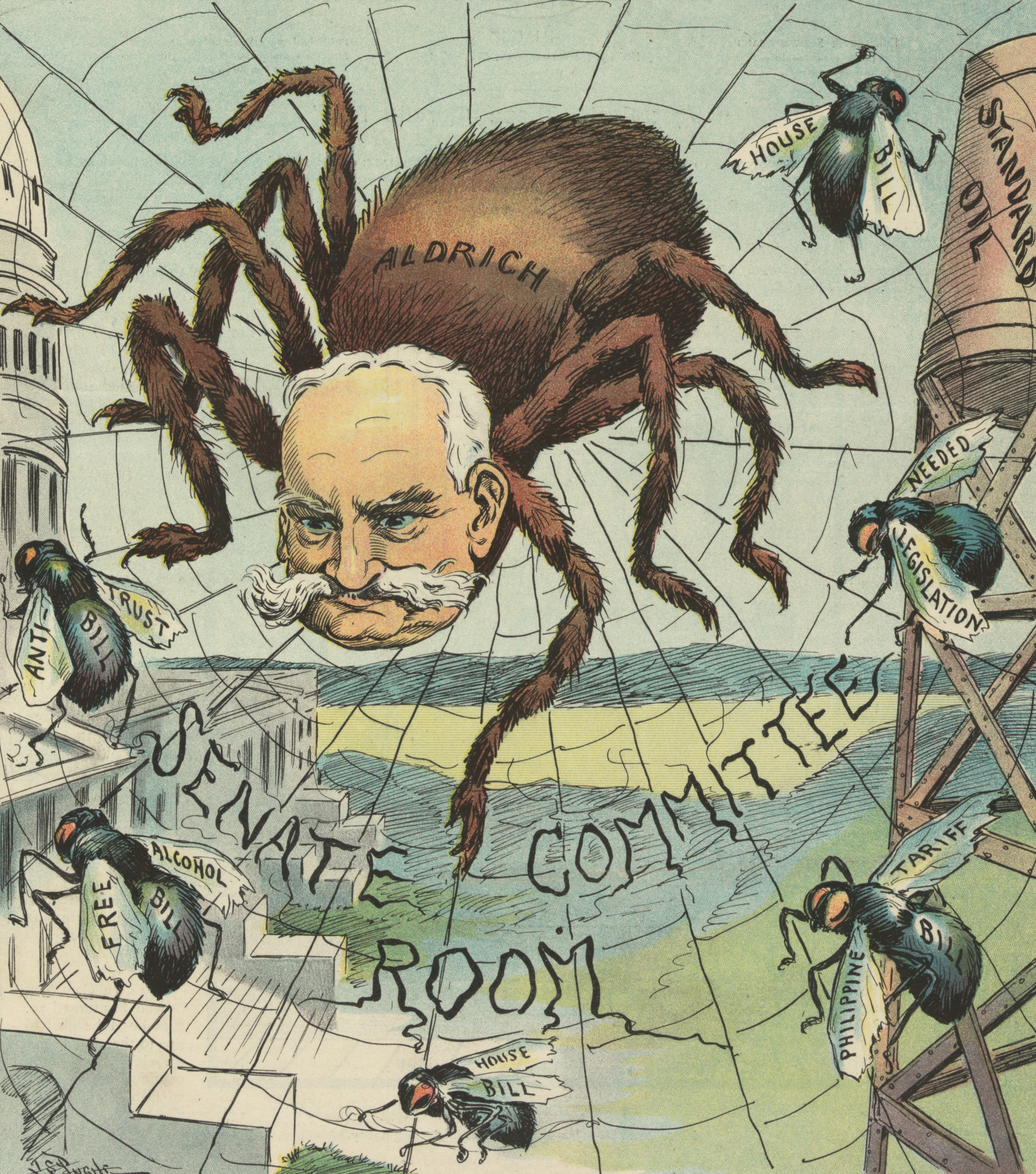 1890년대에 넬슨 W. 올드리치는 코네티컷 주의 오빌 H. 플랫, 아이오와 주의 윌리엄 B. 앨리슨, 위스콘신 주의 존 코이트 스푸너와 함께 상원의 주요 결정을 거의 통제한 "빅 4" 핵심 공화당원 중 한 명이었다.[1] 올드리치의 주요 기반은 은행 규제와 통화 정책을 감독하는 상원 재무 위원회의 의장직이었다.[1] 1890년대 초, 올드리치는 상원을 떠나는 것을 고려했지만, 로드아일랜드 출신의 사업가 마스덴 J. 페리가 그에게 주 내 트롤리 시스템을 통합하고 전력화하는 계획에 참여하도록 설득하여 상원에 남게 되었다. 이후 올드리치는 곧 백만장자가 되었다. 그는 은으로 통화를 뒷받침하는 것을 반대했고, 1896년 윌리엄 매킨리가 금 본위제를 기반으로 출마하도록 설득하는 데 관여했다.[8]4. 3. 3. 로드아일랜드 트롤리 시스템 투자