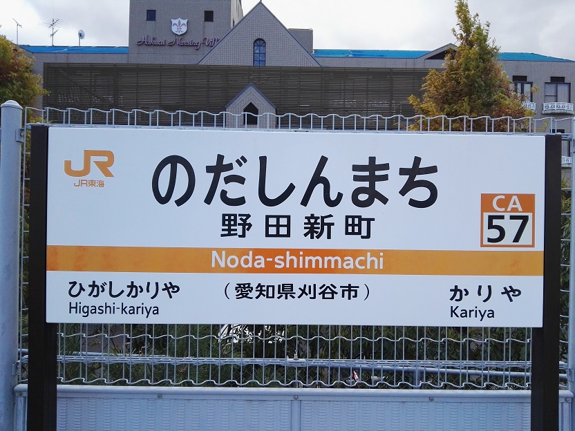 가리야시의 요청으로 도카이도 본선에 노다신마치역이 설치되었다. 2004년 가리야시와 도카이 여객철도(JR 도카이) 사이에 공사 협정이 체결되면서 공사가 시작되었으며, 총 사업비 2814000000JPY은 가리야시가 전액 부담했다.[5] 2007년 개업 당시에는 '가리야 신역'이라는 임시 이름으로 불렸으나, 2006년 12월 14일에 현재의 역명인 '노다신마치'로 확정되었다.[5] 2018년에는 역 번호 CA57이 부여되었다.[5]