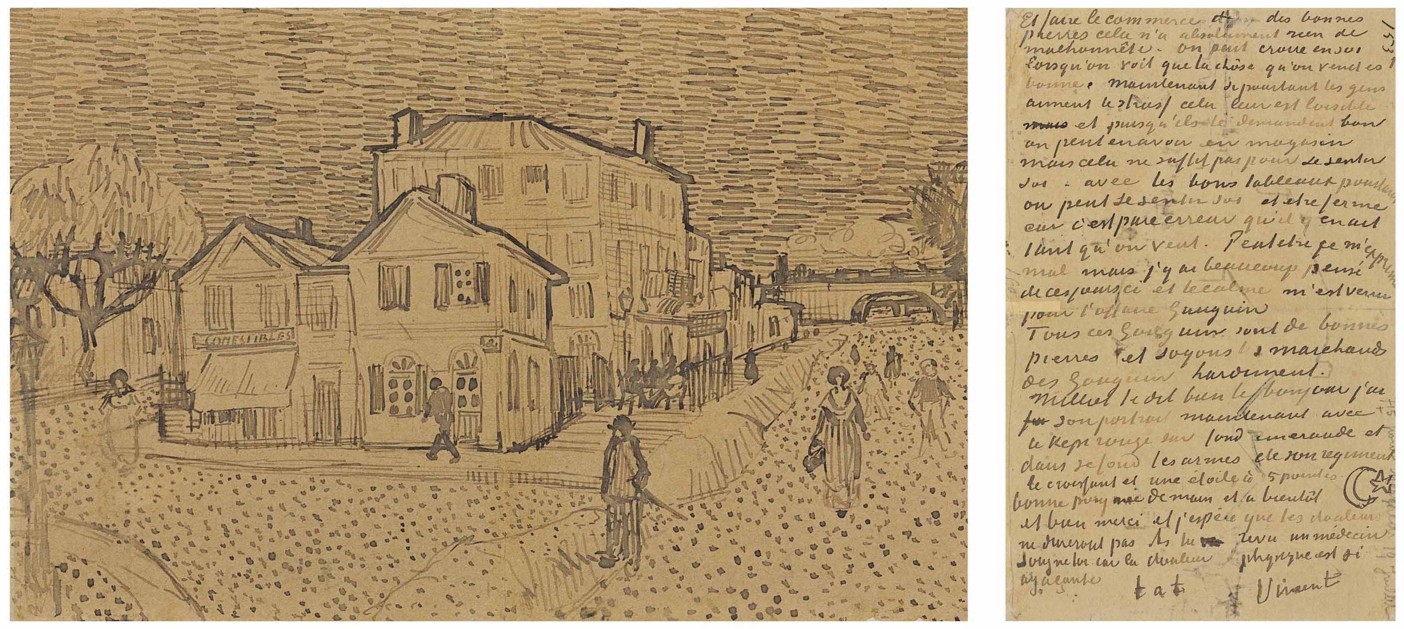 편지에는 그림 속 장소에 대한 구체적인 설명도 담겨 있다. "왼쪽 집은 녹색 덧문이 달린 노란색이다. 나무 그늘에 가려진 곳이다. 이곳은 내가 매일 식사하러 가는 식당이다. 내 친구인 관리인은 철도 다리 두 개 사이에 있는 거리 끝 왼쪽편에 있다. 내가 그린 밤의 카페는 그림에 없는데, 식당 왼쪽에 있다."