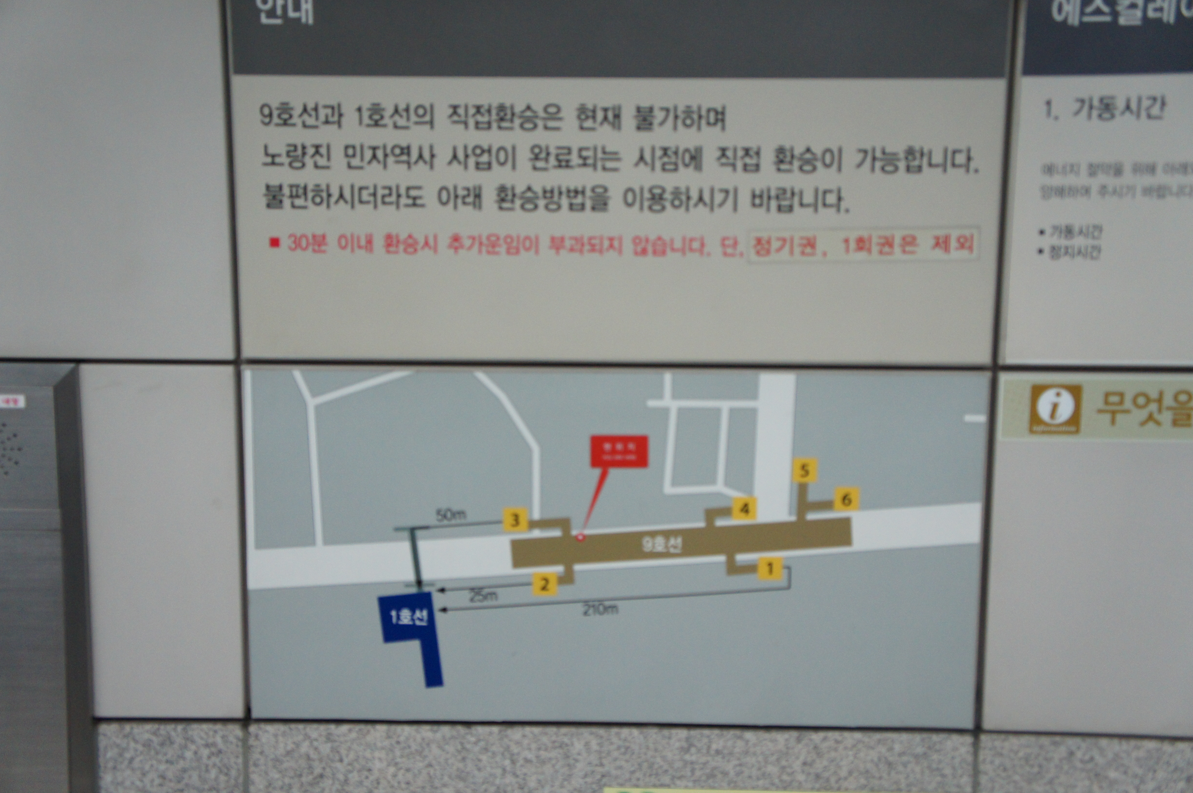 서울 지하철 9호선 노량진역 건설 당시, 한국철도공사와 시공사 간의 마찰로[37] 민자역사 건설 사업 계약이 파기되어 환승 통로가 마련되지 못했다.[38] 이 때문에 2008년 12월 23일 민자역사 착공 이후[36] 9호선 개통부터 2015년까지는 운임 지역 밖을 경유하는 간접 환승 방식이었다. 선/후불 교통카드(1회용 교통카드와 정기 승차권은 환승 처리 불가) 사용 시에만 환승 할인이 적용되었고, 환승 가능 횟수가 1회 차감되었다.[39]