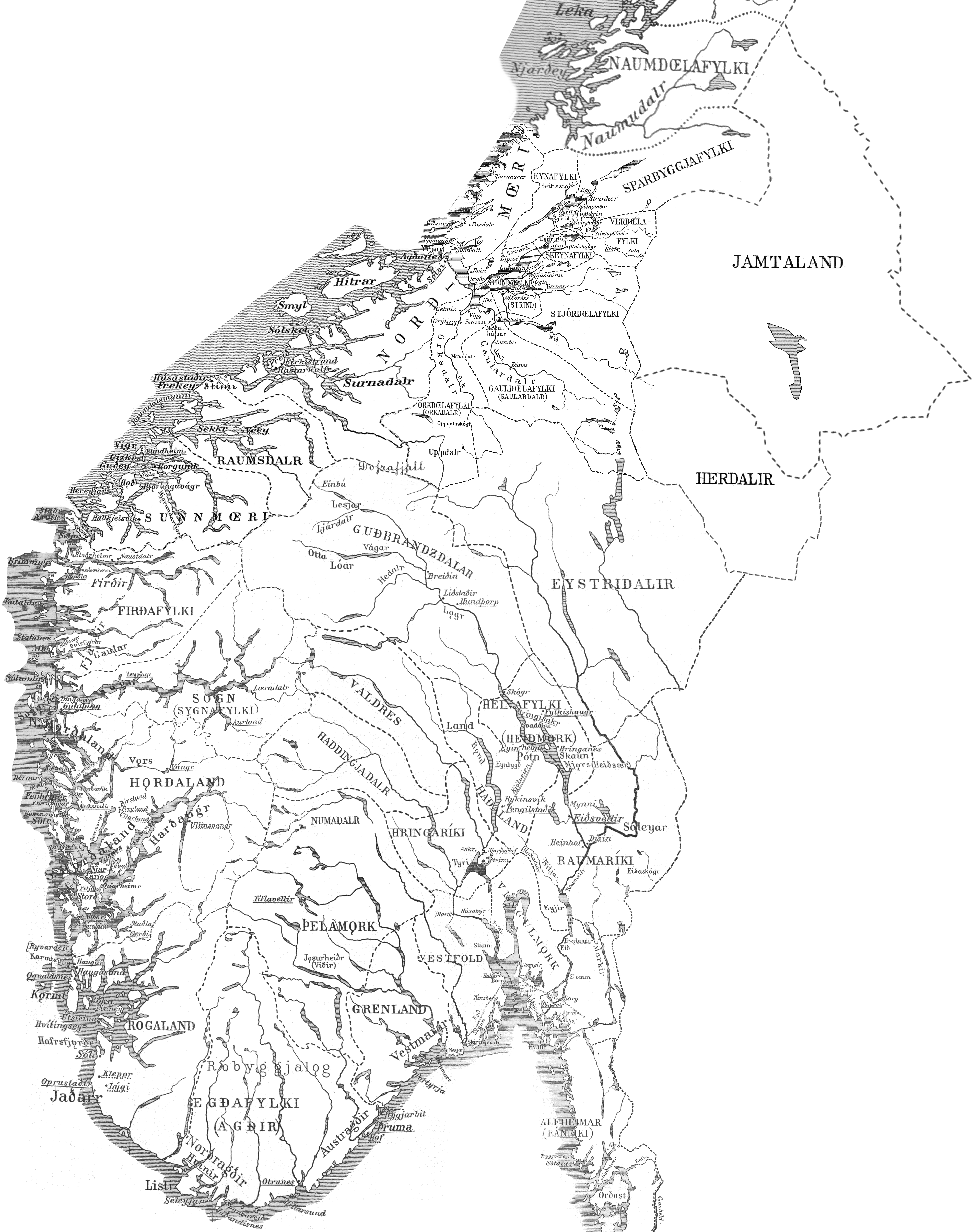 한편, 스칸디나비아 반도 내륙에서도 영토 경계는 유동적이었다. 9세기와 10세기 무렵, 현재 스웨덴과의 국경 지대에 위치한 보후슬렌, 옘틀란드, 헤리에달렌 등의 지역 주민들은 노르웨이, 스베알란드(스웨덴 중부), 예탈란드(스웨덴 남부) 중 어느 곳에도 뚜렷한 국가적 소속감을 가지지 않았을 가능성이 높다. 이 지역들에 대한 지배권을 확립하고 국경을 명확히 하는 것은 점차 강력해지는 중앙 집권 군주 국가들의 과제였으며, 노르웨이는 이들 인접 지역을 자국 영토로 편입시키는 데 비교적 먼저 성공했다. 이러한 역사적 배경 속에서 하랄 1세에 의한 노르웨이 통일과 이후 왕국의 영토 확장이 이루어졌다.