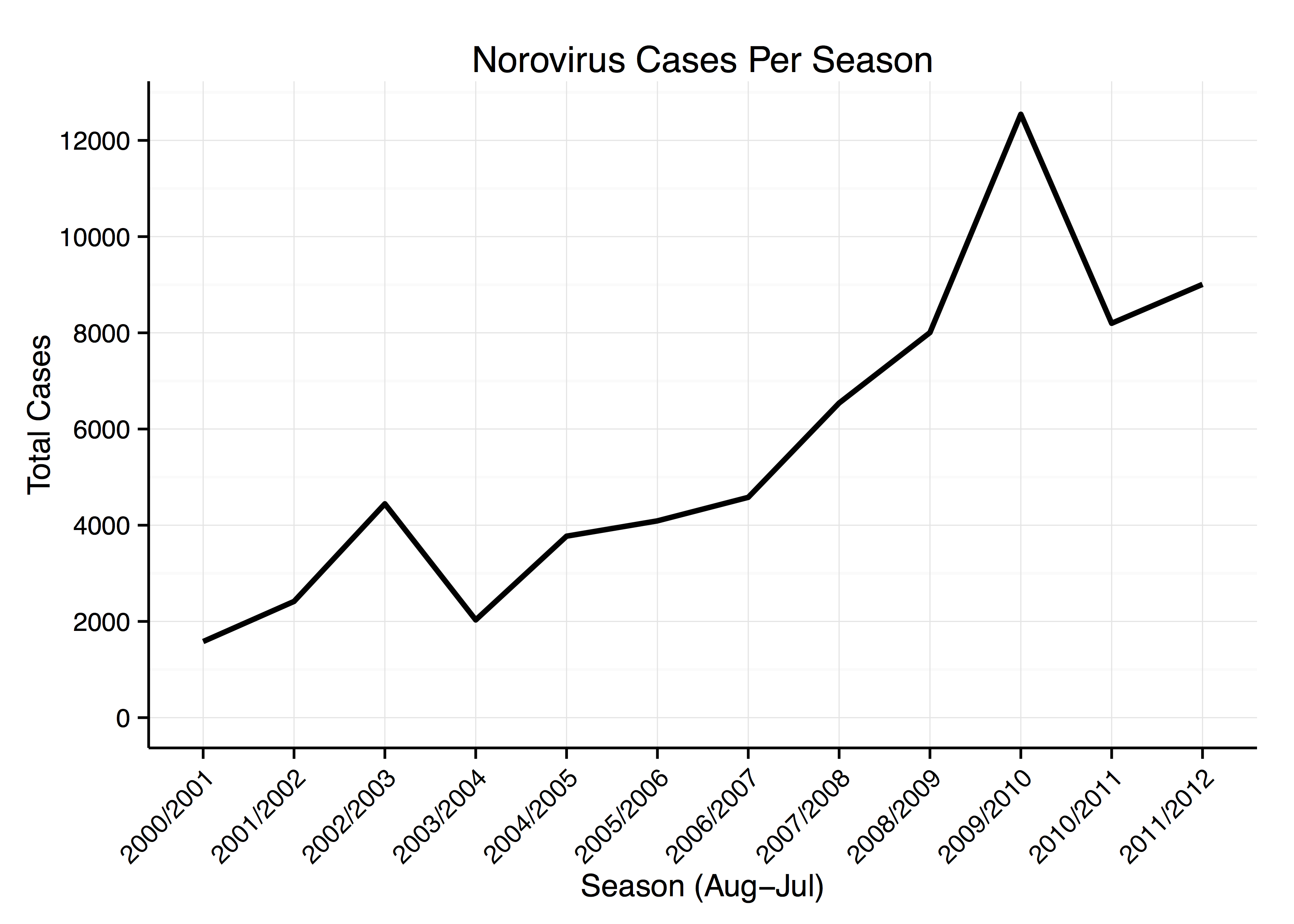 감염 후 발병까지의 잠복기는 12~72시간(평균 1~2일)이며, 증상이 사라진 후에도 1~3주, 길게는 7주 이상 바이러스가 대변으로 배출될 수 있다.[111] 발병은 연중 발생하지만, 특히 11~3월에 많이 보고된다.