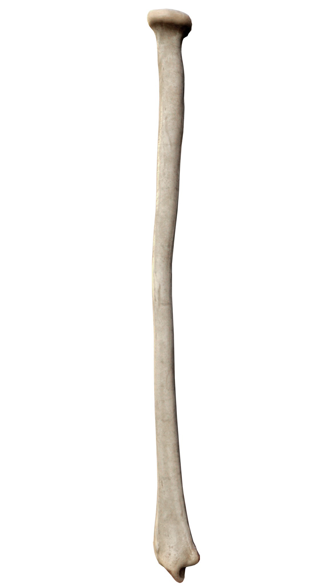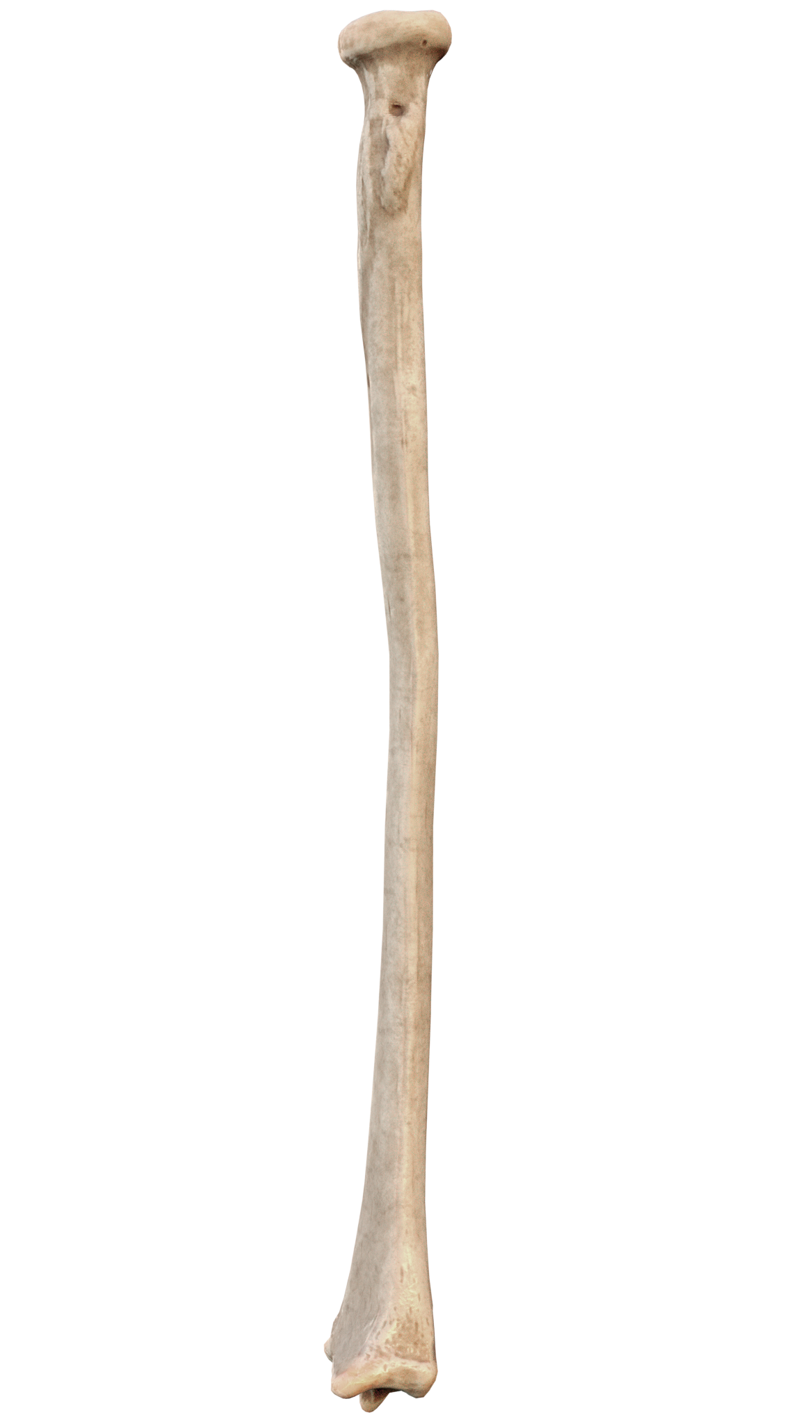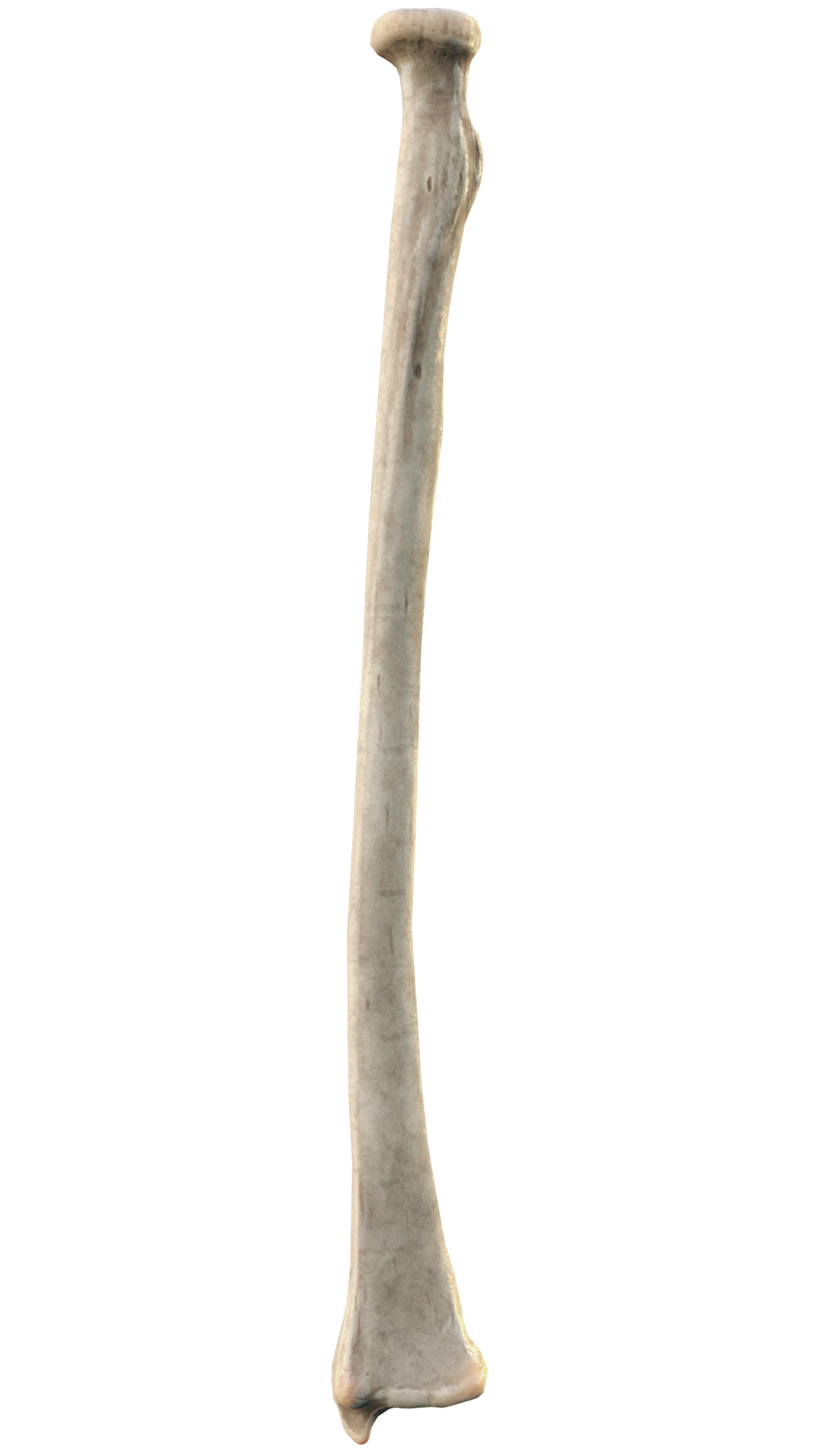 - 머리는 둥글고 매끄럽고 좁아진 목 부분으로 연결되며, 목의 뒤쪽에는 뒤침근의 일부가 부착되는 약간의 융기가 있다.