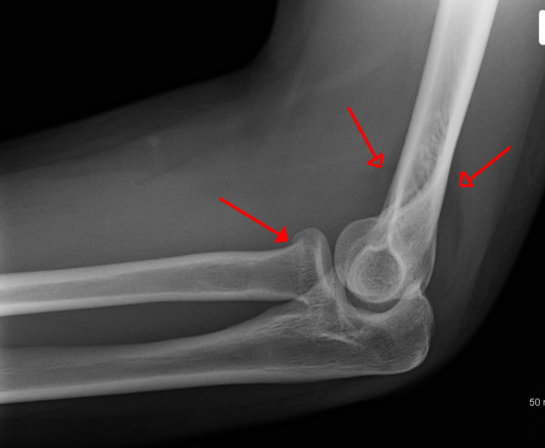 - 근위부 노뼈 골절: 팔꿈치 관절의 관절낭 내 골절은 팔꿈치에서 지방 패드의 변위를 나타내는 지방 패드 징후 또는 "돛 징후"를 유발한다.