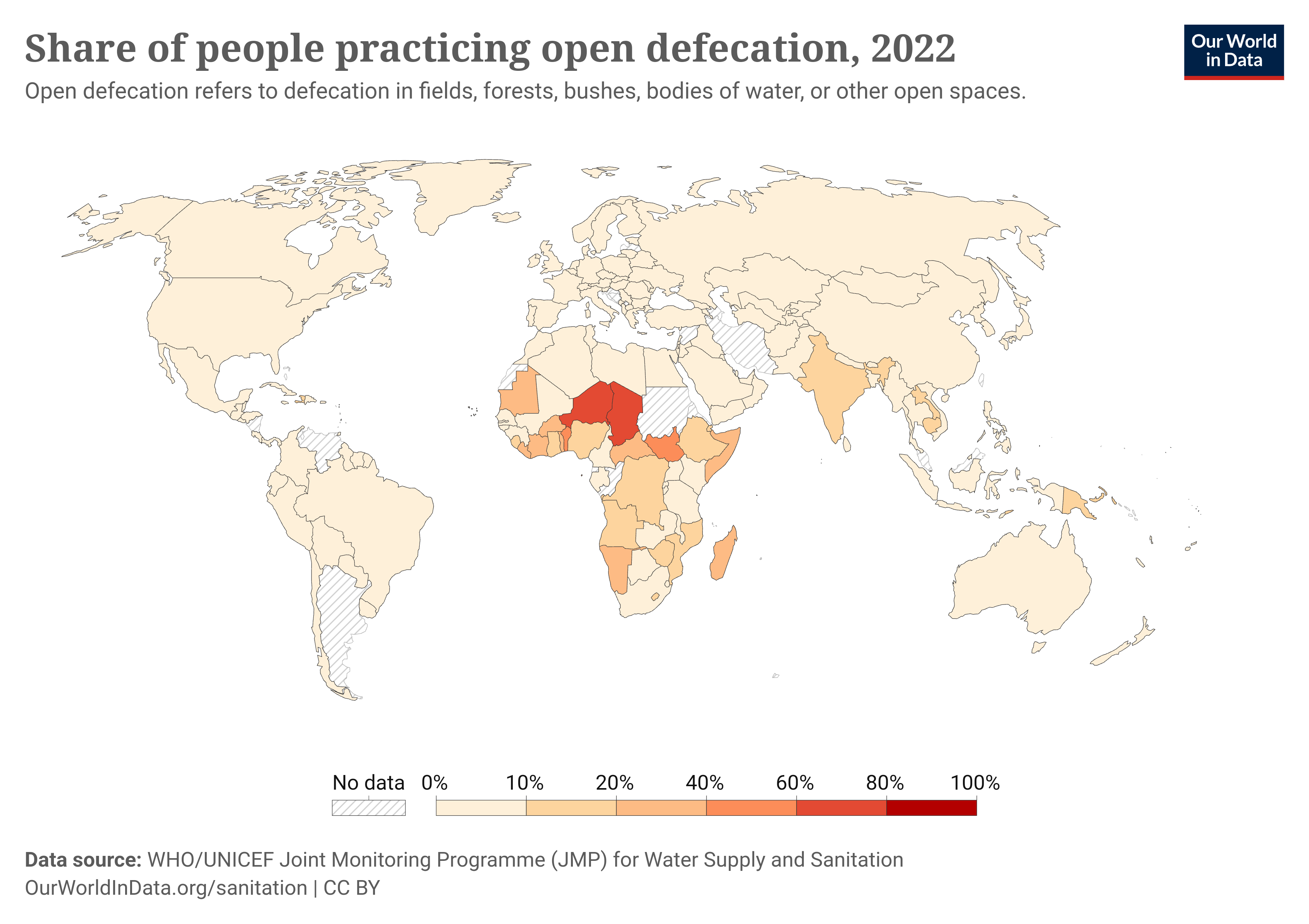 인도는 종교적인 이유 등으로 2015년 기준 5억 2,300만 명이 노상 배변을 하여 세계 최대의 노상 배변 국가였다.[95] 나이지리아에서는 인구의 약 4분의 1인 약 4,600만 명 이상이 노상 배변을 하는 것으로 추정된다. 2019년 무함마두 부하리 대통령은 노상 배변 근절 캠페인을 선언하고, 공공장소에 화장실 설치를 추진하고 있다.[96]