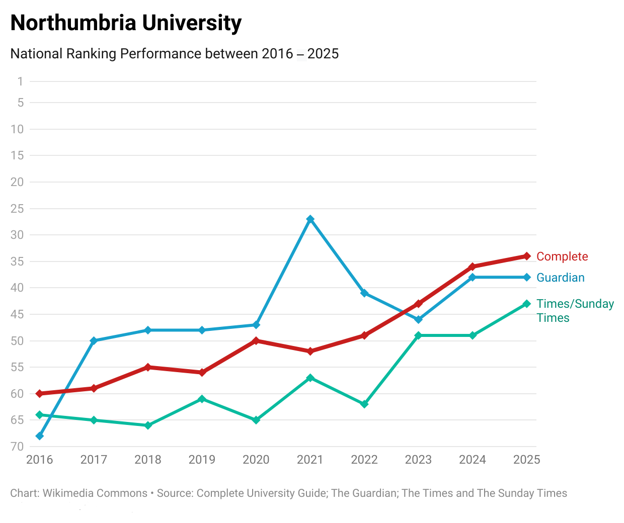 Complete University Guide는 노섬브리아 대학교를 영국 내 59위로 평가했다.[71] QS 세계 대학 순위에서는 751-800위에 자리하고 있다.[72]