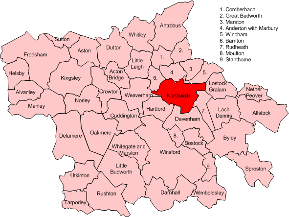 앤더튼 위드 마버리, 바튼, 데븐햄, 하트포드, 킹스미드, 로스톡 그라람, 루드히스, 위버햄, 윈참 등 인접한 시민 교구는 부분적으로 도시화되어 있으며, 2011년 노스위치 시내의 편의 시설을 이용하는 것으로 간주되는 총 인구는 53,391명이다.[32]