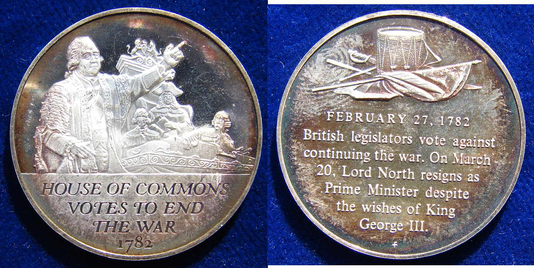 1782년 2월 27일 노스 경에 대한 불신임 결의를 기념하는 미국의 은메달. 이 결의는 미국 독립 전쟁 종식으로 이어졌으며, 노스는 한 달 뒤 사임했다.