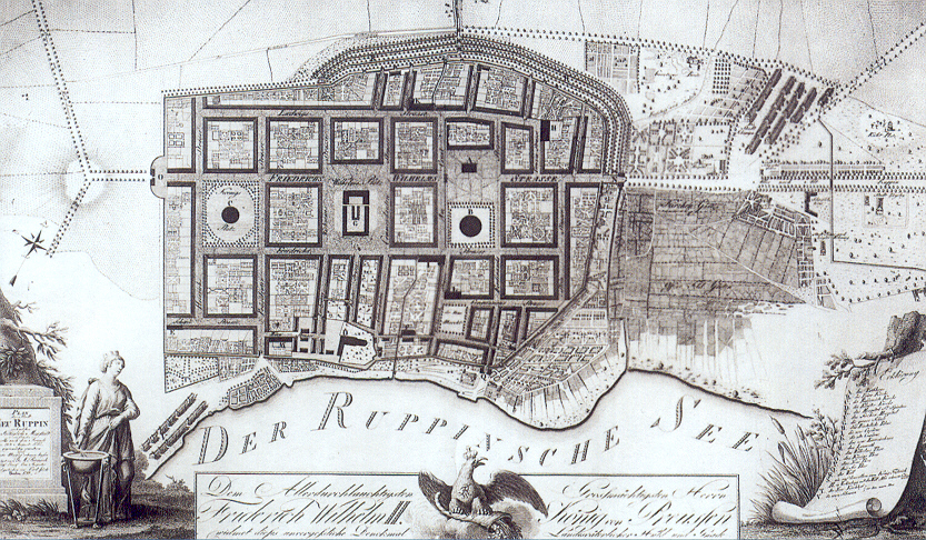 1787년 8월 26일 일요일, 노이루핀 시는 대화재로 큰 피해를 입었다. 오후에 베클리너 토르의 곡물 창고에서 시작된 불은 빠르게 번져 도시의 동쪽과 서쪽 가장자리의 좁은 지역 두 곳을 제외한 대부분을 파괴했다. 이 화재로 401채의 주택, 159채의 부속 건물, 228개의 마구간, 38개의 헛간, 성 마리아 교구 교회, 시청, 개혁 교회, 왕자 궁전이 소실되었다.[8] 재산 피해는 약 60만 탈러에 달했다.
