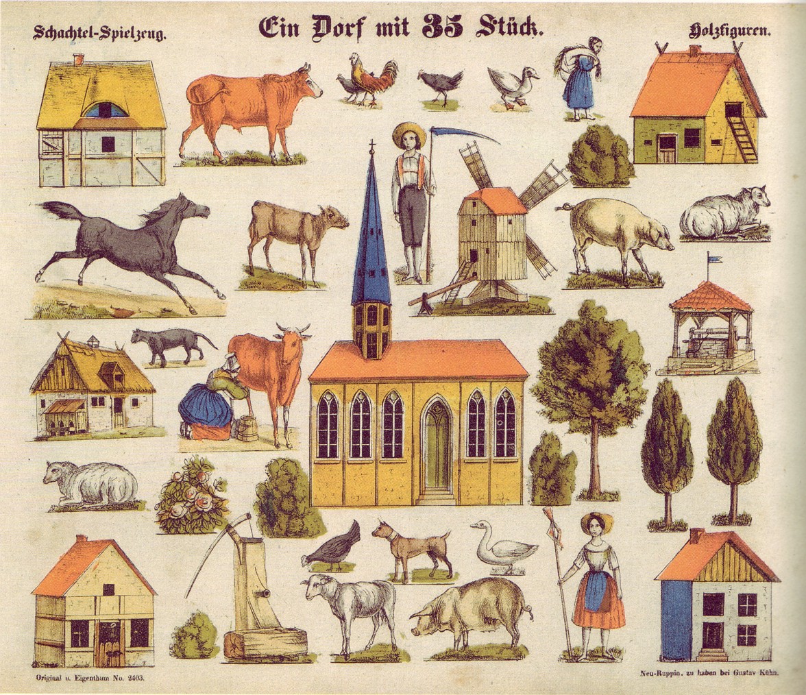 요한 베른하르트 큔(1750-1826)은 노이루핀에서 그림 시트를 제작하기 시작했는데, 오랫동안 손으로 채색된 전단 형식으로 주제별로 디자인되었다. 그의 아들 구스타프 큔(1794-1868)은 연간 3백만 부 이상을 인쇄했다(예: 1870/71년 프랑스-프로이센 전쟁). 이 인쇄물은 'Neu-Ruppin, zu haben bei Gustav Kühn'이라는 문구와 함께 전 세계적으로 알려졌다. 필리프 엠익, 헤르만 림슈나이더, 프리드리히 빌헬름 베르게만이 이 인기 있는 그림 시트를 제작했다. 이 세 그림 시트 제작자 모두 독일의 그림 시트 제조업체 경쟁(독일 전역에 60개 이상의 회사)에서 살아남아 오랫동안 선두를 차지했다.[12]