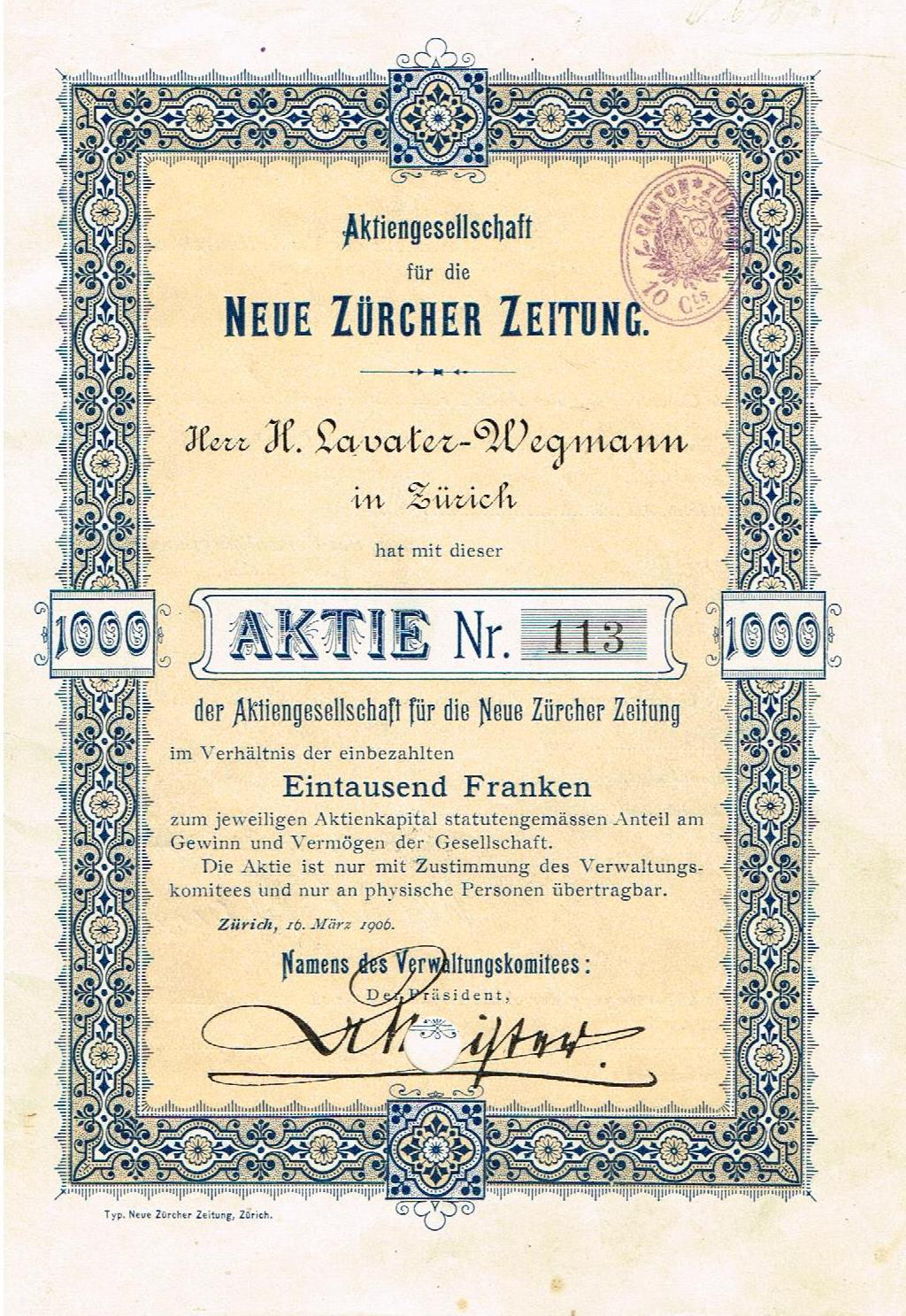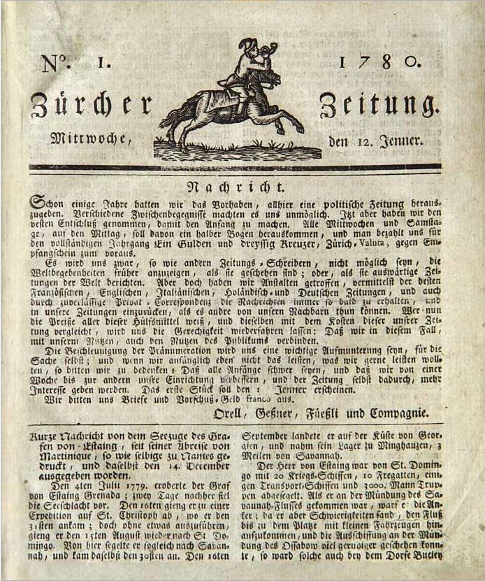 가장 오래된 신문 중 하나로, 1780년 1월 12일 스위스 화가이자 시인인 잘로몬 게스너가 ''취리허 차이퉁''이라는 이름으로 창간하여 편집했다.[5][7] 1821년에 노이에 취르허 차이퉁|노이에 취르허 차이퉁de으로 이름이 변경되었다.