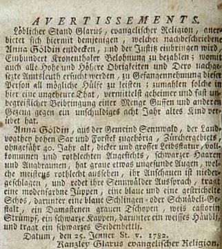 1782년 1월 25일 ''취리허 차이퉁''에 게재된 안나 굘디에 대한 수사 통지