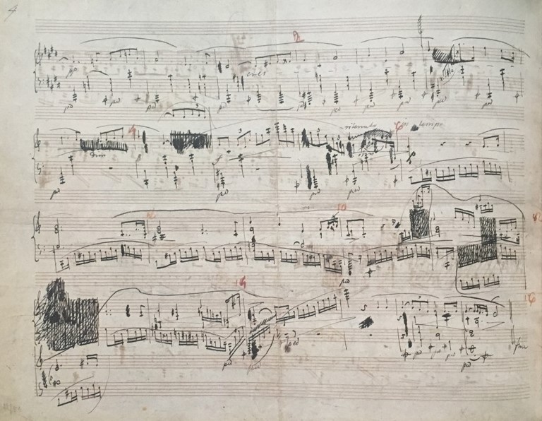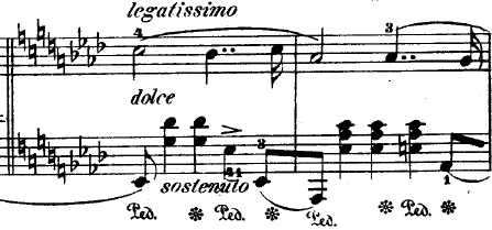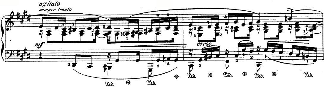 - A' 부분: 불협화음 아르페지오가 나타난 후 첫 번째 주제(A)가 다시 등장한다. 이때 오른손에는 약간 변형된 화음과 장식음이 사용된다.
