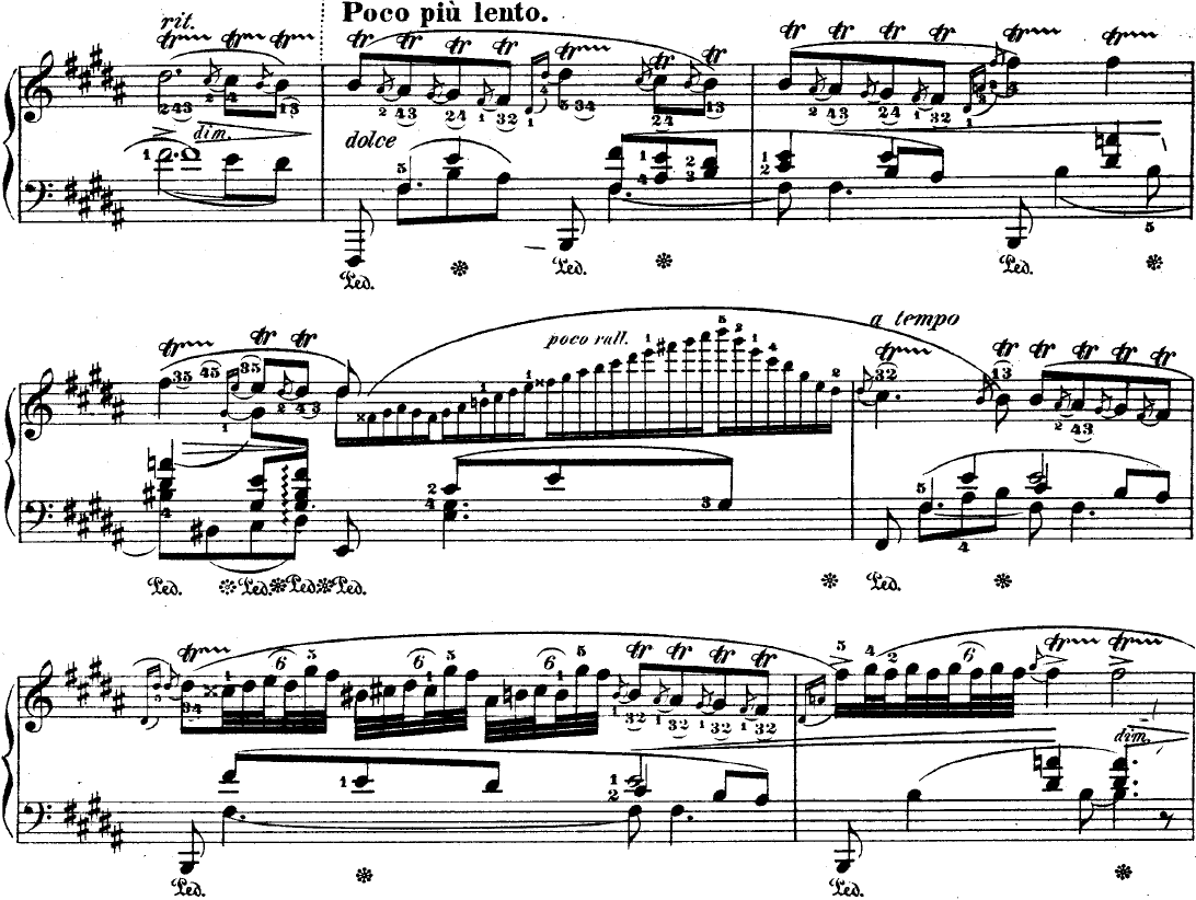 - A 섹션: E장조의 느리고 서정적인 기본 주제로 시작한다.