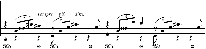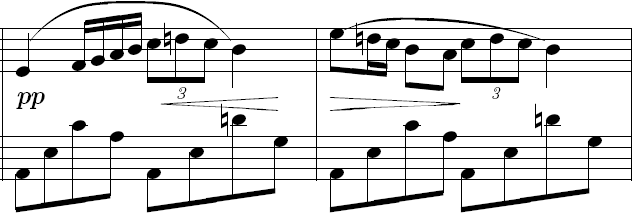 재현부에서는 주제가 변형되어 나타난다. 그 후, 58마디부터 61마디까지 상행했다가 하행하는 네 개의 튜플렛이 등장한다. 이들은 각각 18잇단음표, 35잇단음표, 11잇단음표, 13잇단음표로 구성되어 있으며, 모두 마장조 음계를 따른다. 곡은 매우 여린 피아니시시모(ppp)로, 높은 올림다(C♯)와 낮은 올림다(C♯) 음을 연주하며 조용히 마무리된다.3. 음반