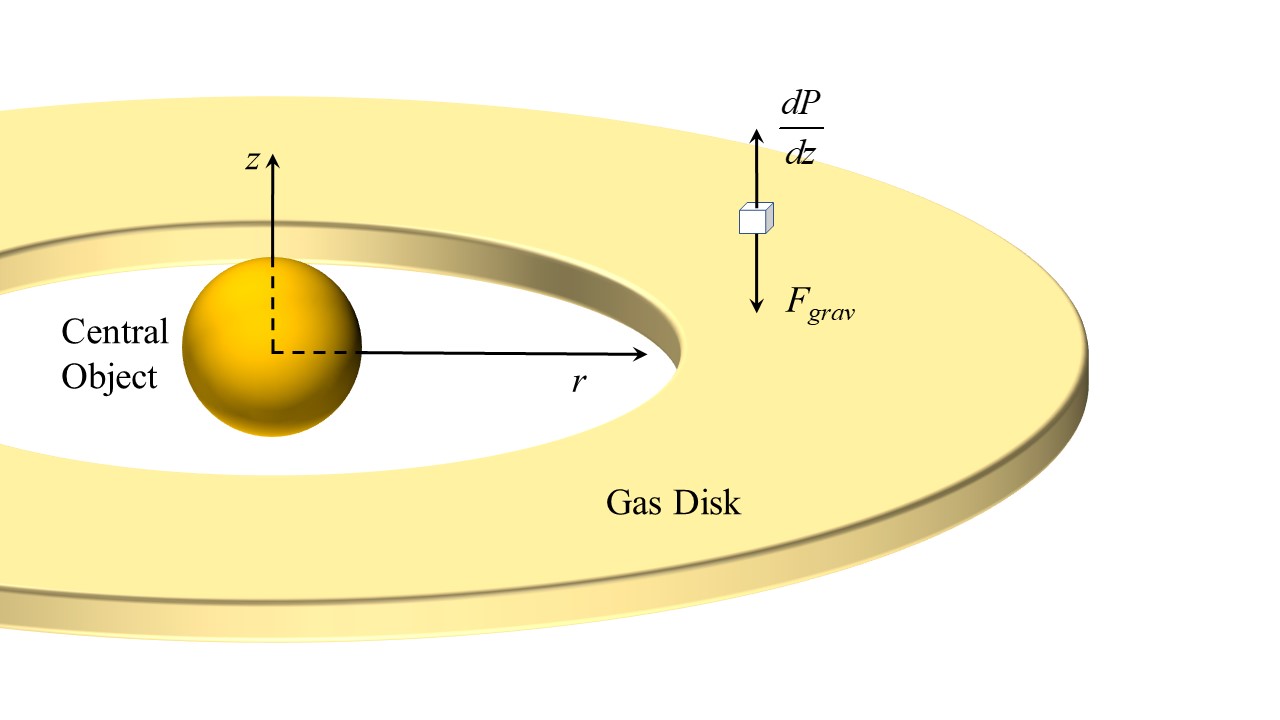 원시별과 같이 응축된 중심 물체 주위의 가스 디스크의 경우, 행성의 높이척도와 유사하게 디스크 높이척도를 유도할 수 있다. 중심 물체에 비해 질량이 매우 작은 가스 디스크를 가정한다. 이 디스크는 별로부터 받는 중력의 수직 성분(''z'' 방향)과 가스 압력 기울기가 정역학적 평형 상태에 있다고 가정한다. 중력 성분은 디스크의 중간 평면을 향한다.