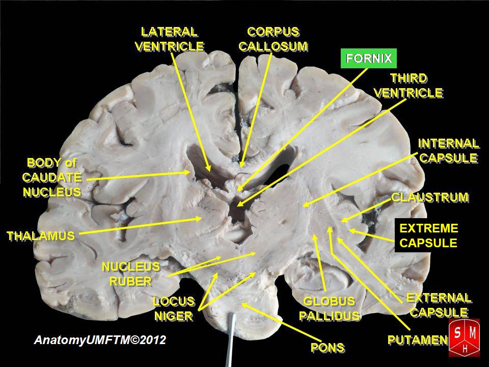 - 앞쪽 섬유 (''전교련 뇌궁'')는 기저 전뇌의 중격 핵과 뇌의 각 절반의 측좌핵에서 끝난다.