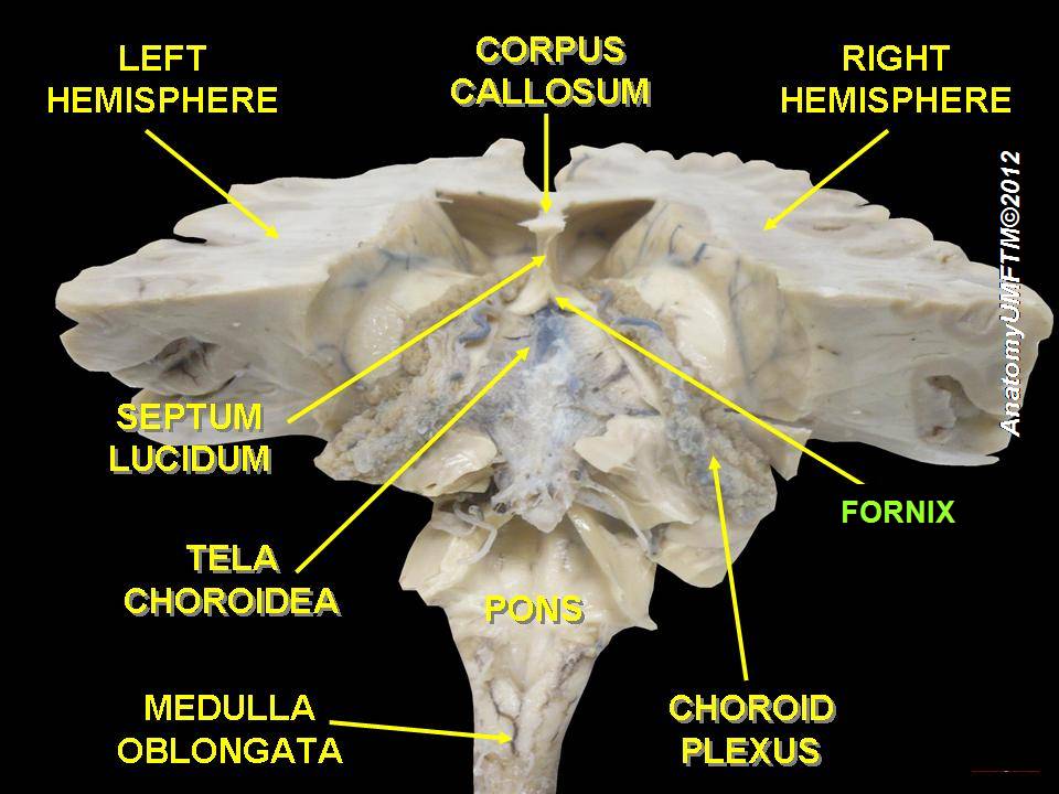 섬유는 뇌의 각 측면의 해마에서 해마 채로 시작한다.[1] 좌우 측면은 각각 뇌궁의 다리(복수형: ''crura'')라고 불린다.[1] 섬유 묶음은 뇌의 정중선에서 합쳐져 뇌궁의 ''몸통''을 형성한다.[1] 투명 중격(측뇌실을 분리하는 막)의 아래쪽 가장자리는 뇌궁 몸통의 위쪽에 부착되어 있다.[1]3. 기능
