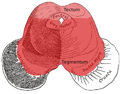 - 그물체: 중뇌의 넓은 영역으로, 하위 운동 뉴런, 통증 둔감화 경로, 각성 및 의식 시스템, 자율신경계 반사 등에 관여한다.