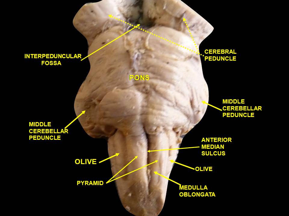 숨뇌 앞가쪽 고랑은 피라미드 측면에 위치하며, 여기서 뇌신경 XII (설하신경)의 작은 가지가 나온다. 앞가쪽 고랑 측면에는 올리브가 있는데, 이는 숨뇌의 팽창된 부분으로 아래에 다양한 핵과 구심성 섬유를 포함하는 아래 올리브 핵[13]이 있다. 올리브 측면에는 뇌신경 IX (설인신경), X (미주 신경), XI (부신경)의 작은 가지가 있다. 피라미드는 뇌교와의 접합부에서 끝나며, 이 접합부에서 뇌신경 VI (눈돌림 신경), VII (얼굴 신경), VIII (안뜰달팽이 신경)이 나타난다.