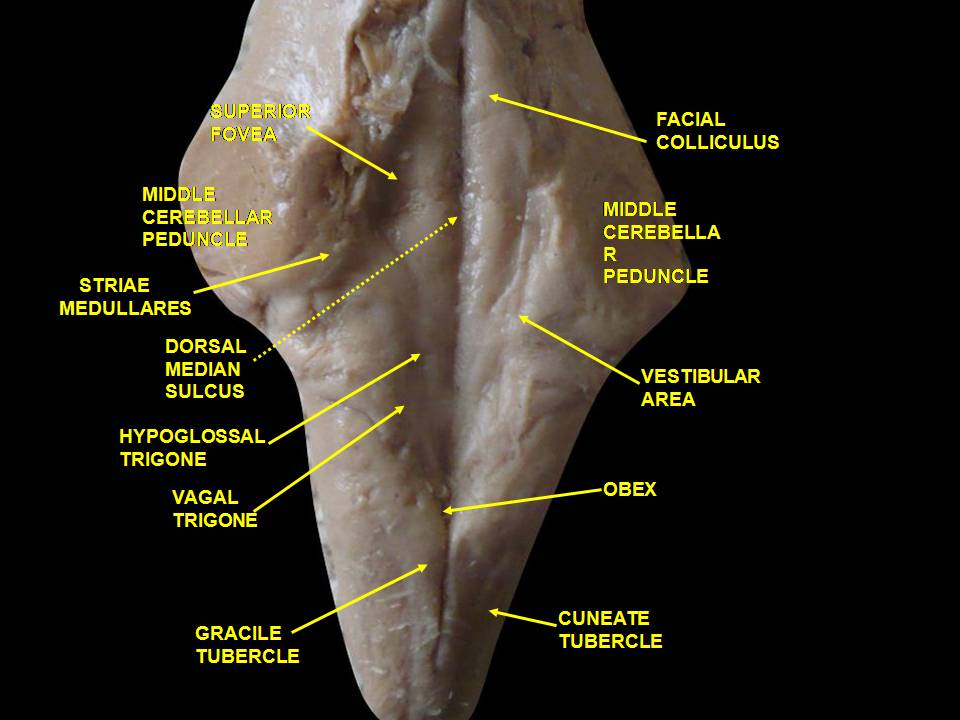 칼끝 위에는 넷째 뇌실의 바닥이 있다. 넷째 뇌실 바닥에서는 다양한 핵을 시각화할 수 있는데, 정중선과 칼끝 바로 위에는 미주 신경 삼각이, 그 위에는 설하신경 삼각이 있다. 각 삼각 아래에는 해당 뇌신경에 대한 운동 핵이 있다. 이 삼각 위쪽에는 양쪽으로 뻗어 있는 숨뇌 줄무늬 섬유가 있다. 머리쪽으로 가면 얼굴 언덕이 있는데, 이는 얼굴 신경 핵이 아닌 눈돌림(뇌신경 VI) 핵의 표면을 가로지르는 얼굴 신경 축삭 때문에 생긴 융기이다. 이 융기들의 측면에는 경계 고랑이 있으며, 이는 내측 운동 뉴런과 측면 감각 뉴런을 분리한다. 경계 고랑 측면에는 전정계 영역이 있다. 머리쪽으로 가면 아래, 중간, 위 소뇌 다리가 중간뇌를 소뇌에 연결하고, 위 소뇌 다리 바로 위에는 위 수질 덮개가 있고 두 활차 신경이 있다. 이는 아래 둔덕이 바로 머리쪽에 있어 꼬리쪽 중간뇌를 표시하므로 뇌교의 끝을 나타낸다.