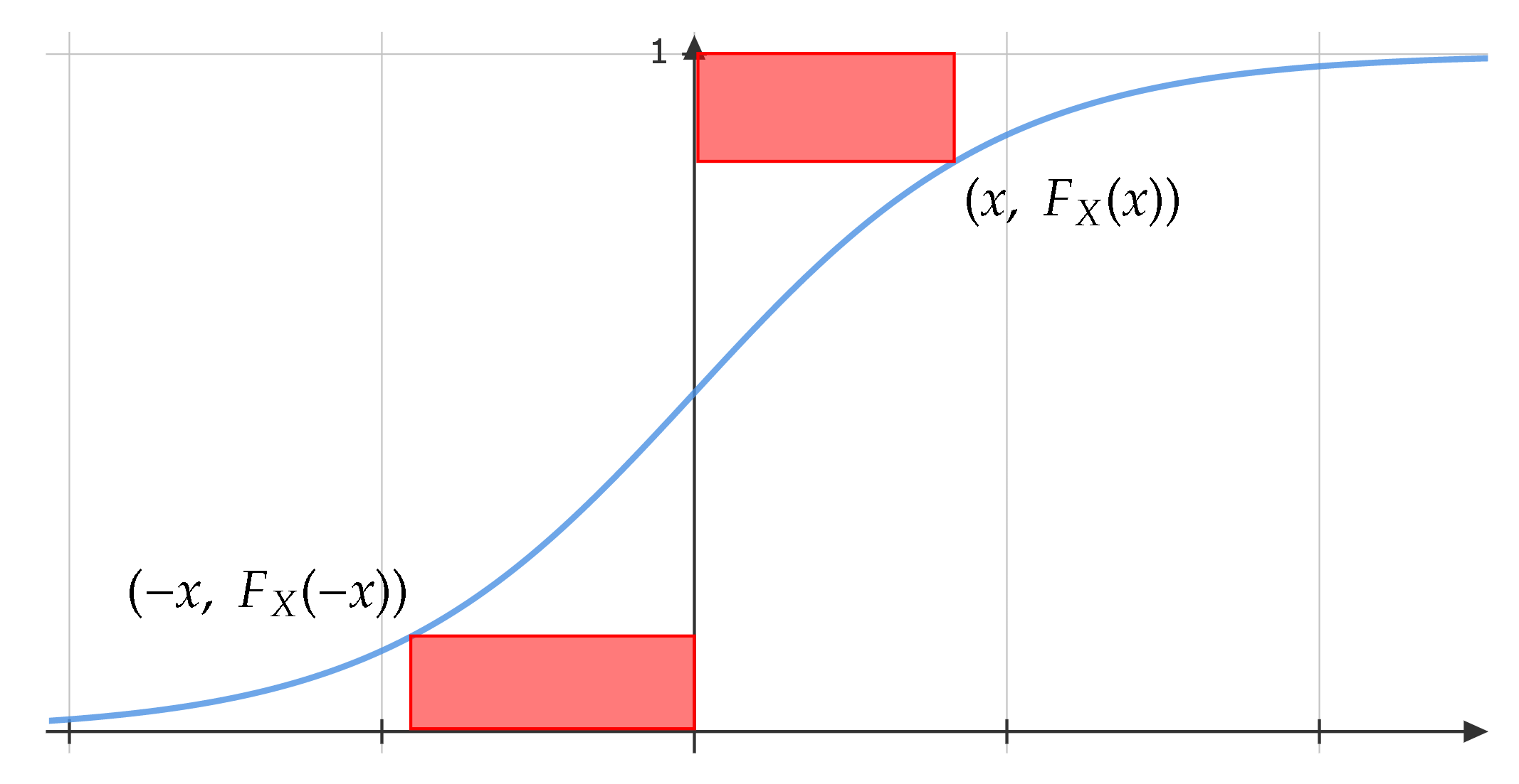 기댓값이 0이고 표준 편차 가 1인 정규 분포 함수의 접힌 누적 분포 예. 누적 분포 F 의 그래프는 보통 S자 모양을 갖지만, 그래프의 상반부(누적 확률이 0.5를 넘는 부분)를 아래로 접어서 표현하는 방식도 있다. 이를 '''접힌 누적 분포''' 또는 '''산 모양 그림'''이라고 부른다. [5] [6] 수학적으로는 다음과 같이 정의된다. :F_\text{fold}(x)=F(x)1_{\{F(x)\leq 0.5\}}+(1-F(x))1_{\{F(x)>0.5\}} 여기서 1_{\{A\}} 는 특정 조건을 만족할 때만 1이 되고, 그렇지 않으면 0이 되는 지시 함수 를 의미한다. 즉, 누적 분포 F(x) 가 0.5 이하일 때는 원래 값을 그대로 사용하고, 0.5보다 클 때는 1-F(x) 값을 사용한다. 1-F(x) 는 생존 함수라고도 불린다. 이런 방식으로 그래프를 그리면 산봉우리 모양이 되며, 누적 확률 0.5를 기준으로 올라가는 부분과 내려오는 부분에 대해 각각 다른 눈금을 사용한다. 접힌 누적 분포 그래프는 분포의 중앙값 , 분산 (특히 중앙값으로부터의 평균 절대 편차 [7] ) 및 왜도 (분포가 얼마나 비대칭적인지)를 시각적으로 파악하는 데 유용하다.