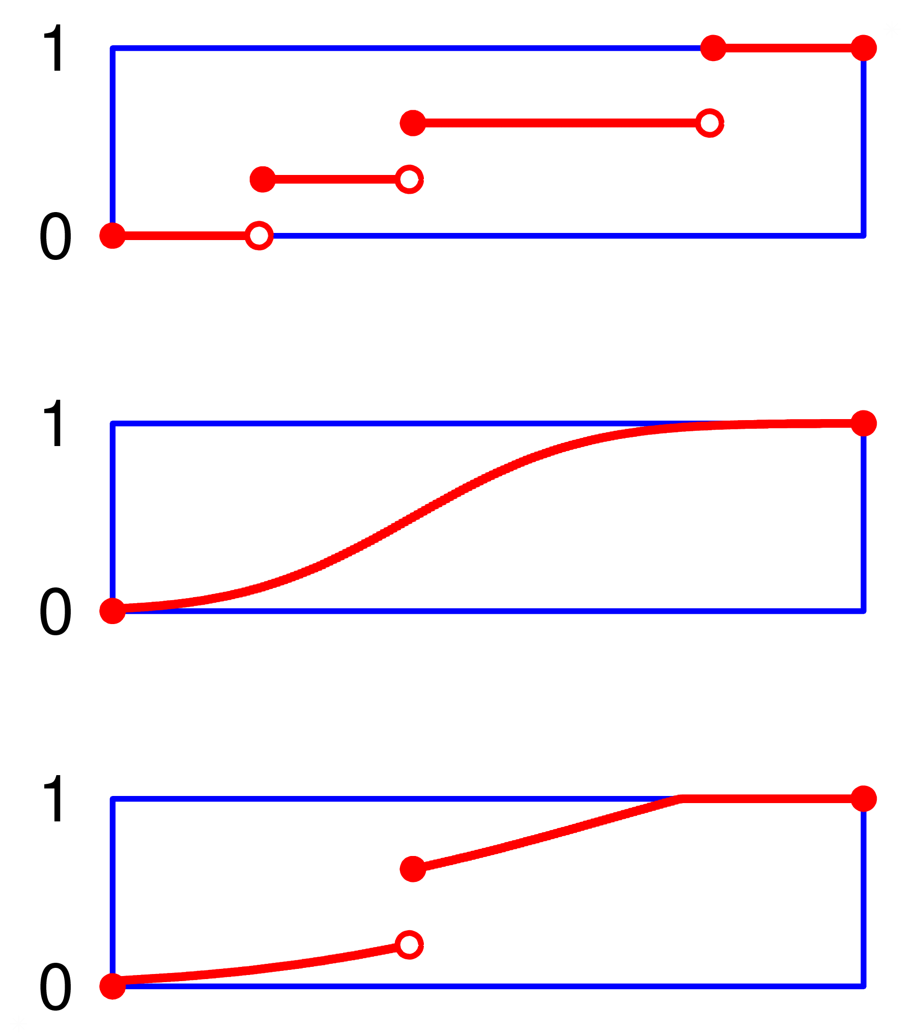 이산 확률 분포, 연속 확률 분포, 이산적인 부분과 연속적인 부분이 모두 존재하는 분포에 대한 각각의 누적분포함수 모든 누적 분포 함수(CDF) F_X 는 단조 증가 함수이며 [2] [12] 우연속 함수이다. [2] [12] 이는 CDF가 càdlàg 함수임을 의미한다. 또한 다음 극한값을 만족한다. :\lim_{x \to -\infty} F_X(x) = 0, \quad \lim_{x \to +\infty} F_X(x) = 1. 이 세 가지 속성(단조 증가, 우연속, 위 극한값 만족)을 가진 모든 함수는 어떤 확률 변수 의 CDF가 될 수 있다.확률 변수 X 의 누적분포함수 F_X 의 형태는 X 의 성질(이산성, 연속성, 특이성 등)과 밀접한 관련이 있다. '''이산 확률 변수'''확률 변수 X 에 대하여, 다음 두 조건은 서로 동치 이다.X 는 이산 확률 변수이다. (즉, 확률의 총합이 1이 되는 가산 집합 A 위에 확률 질량이 분포한다: \operatorname{Pr}(X\in A)=1 )X 의 CDF F_X 에서 모든 불연속점에서의 점프 크기(좌극한과 함숫값의 차이)의 합이 1이다: \textstyle\sum_{x\in\mathbb R}\left(F_X(x)-\lim_{y\to x^-}F_X(y)\right)=1 특히, 계단 함수 형태의 누적분포함수를 갖는 확률 변수 는 이산 확률 변수이다. 그러나 그 역은 성립하지 않을 수 있다. (예: 오른쪽 그림처럼 가산 무한 개의 불연속점을 갖는 경우)X 가 순수하게 이산적인 확률 변수이고 확률 p_i = \operatorname{P}(X=x_i) 로 값 x_1,x_2,\ldots 을 가진다면, X 의 CDF는 각 x_i 에서 불연속이며, 다음과 같이 표현된다. :F_X(x) = \operatorname{P}(X\leq x) = \sum_{x_i \leq x} \operatorname{P}(X = x_i) = \sum_{x_i \leq x} p_i. '''연속 확률 변수'''확률 변수 X 에 대하여, 다음 두 조건은 서로 동치 이다.X 는 연속 확률 변수이다. (즉, 임의의 한 점 x\in\mathbb R 에서 확률이 0이다: \operatorname{P}(X=x)=0 )X 의 CDF F_X 는 연속 함수 이다. '''절대 연속 확률 변수''' 연속 확률 변수 중 특별한 경우로, 확률 변수 X 에 대하여 다음 두 조건은 서로 동치 이다.X 는 절대 연속 확률 변수이다. (즉, X 의 확률 분포 \operatorname{Pr}(X\in\bullet) 가 르베그 측도 에 대해 절대 연속 측도 이거나, 동등하게 X 가 확률 밀도 함수 f_X(x) 를 갖는다.)X 의 CDF F_X 는 임의의 닫힌구간에서 절대 연속 함수이다. 이 경우, 모든 실수 a 와 b (a < b )에 대해 다음 관계가 성립한다. :F_X(b)-F_X(a) = \operatorname{P}(a< X\leq b) = \int_a^b f_X(x)\,dx 여기서 적분은 르베그 적분 이다. 함수 f_X 는 거의 어디서나 F_X 의 미분 과 같으며, X 분포의 확률 밀도 함수 라고 불린다. '''특이 확률 변수''' 연속 확률 변수 중 절대 연속이 아닌 경우도 있다. 확률 변수 X 에 대하여, 다음 두 조건은 서로 동치 이다.X 는 특이 확률 변수이다. (즉, X 의 확률 분포 \operatorname{Pr}(X\in\bullet) 와 르베그 측도 가 서로 특이 측도이다.)X 의 CDF F_X 는 연속 함수 이지만, 르베그 측도 기준으로 거의 어디서나 그 미분 값이 0이다: F_X'(x)=0 a.e. (예: 칸토어 분포) '''누적분포함수의 분해''' 르베그 분해 정리에 따라, 임의의 누적분포함수 F 는 이산 부분(F_{\operatorname{disc}} ), 절대 연속 부분(F_{\operatorname{a.c.}} ), 특이 연속 부분(F_{\operatorname{s.c.}} )의 합으로 유일하게 표현될 수 있다. 각 부분은 CDF이며, 이들의 가중치 합으로 원래 CDF를 나타낸다. :F=c_{\operatorname{disc}}F_{\operatorname{disc}}+c_{\operatorname{a.c.}}F_{\operatorname{a.c.}}+c_{\operatorname{s.c.}}F_{\operatorname{s.c.}} 여기서 가중치 c_{\operatorname{disc}}, c_{\operatorname{a.c.}}, c_{\operatorname{s.c.}} \ge 0 이고 c_{\operatorname{disc}}+c_{\operatorname{a.c.}}+c_{\operatorname{s.c.}}=1 이다. 이는 어떤 확률 변수라도 이산형, 절대 연속형, 특이 연속형 확률 변수의 볼록 결합으로 생각할 수 있음을 의미한다. 예를 들어, 위 그림 중 세 번째는 이산 부분(c_{\operatorname{disc}}>0 )과 연속 부분(c_{\operatorname{a.c.}}>0 )을 모두 갖는 경우(c_{\operatorname{s.c.}}=0 )를 보여준다.