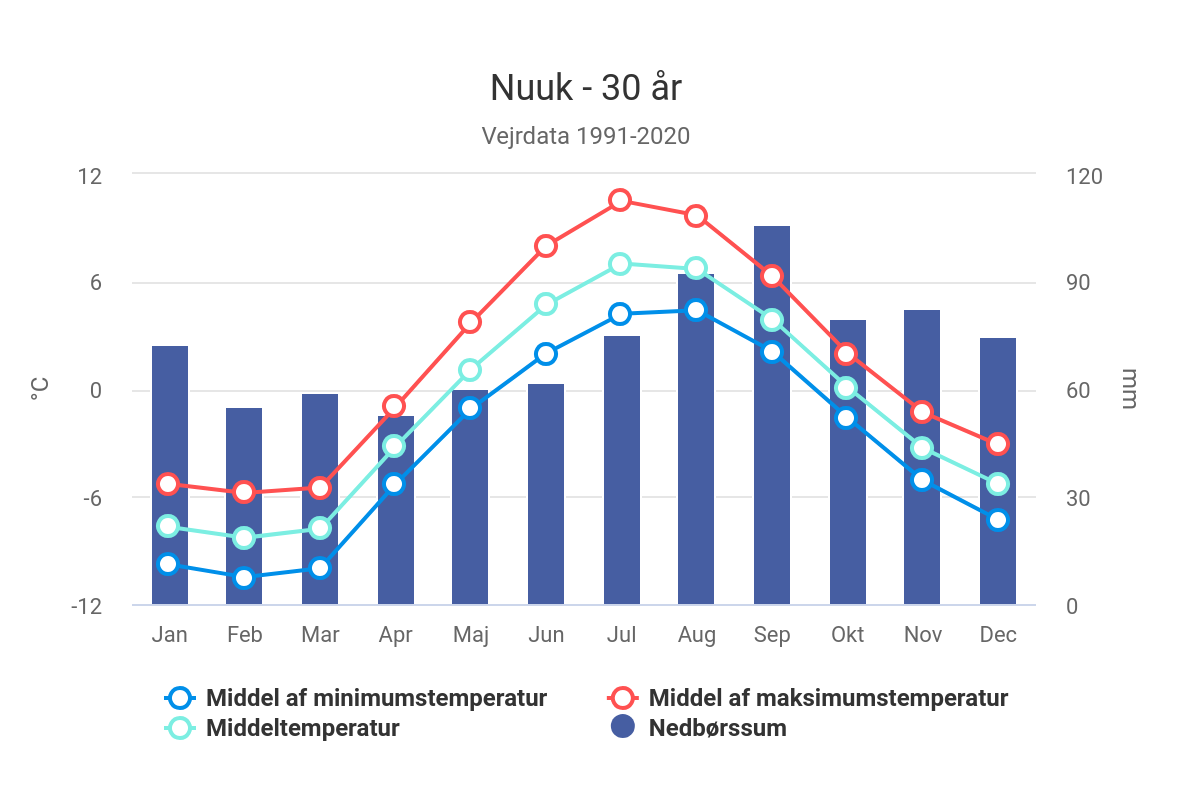 누크는 길고 춥고 눈이 많이 오는 겨울과 짧고 서늘한 여름을 가진 해양성 툰드라 기후(쾨펜 ET)를 보인다. 누크의 겨울은 비교적 춥지만, 미국의 알래스카나 동시베리아의 일부 지역과 같은 다른 툰드라 기후에 비해 온화하다. 대신 겨울철 기온은 북유럽의 동일 위도와 비슷하다. 12월 21일, 즉 1년 중 가장 짧은 날이자 가장 긴 밤에는 해가 오전 11시 22분에 뜨고 오후 3시 28분에 진다. 반면, 1년 중 가장 긴 날이자 가장 짧은 밤인 6월 21일에는 해가 오전 3시 53분에 뜨고 오전 1시 03분까지 지지 않아 끊임없는 시민 황혼을 만들어낸다. 누크는 1년 내내 짧은 기간 동안 온화한 기온을 보일 수 있으며, 매달 13°C 이상을 기록했지만, 6월, 7월, 8월, 9월에만 더운 날씨(22.5°C 이상으로 정의)를 기록했다. 월평균 기온은 -9°C에서 7°C 사이이며, 역대 최고 기온과 최저 기온은 1984년 1월 14일의 -32.5°C[76]에서 2008년 7월 6일의 26.3°C[76] 사이이다. 누크의 최대 풍속 기록은 68km/h이다.