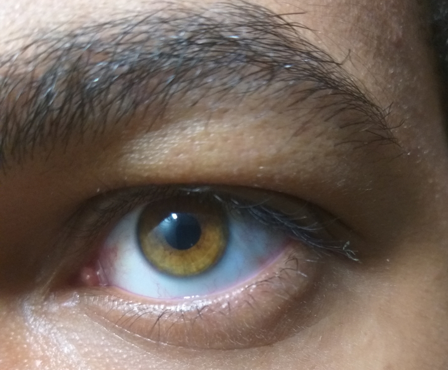 # 홍채 기질에 있는 호박색 또는 밝은 갈색 색소 침착 (낮거나 보통의 멜라닌 농도)