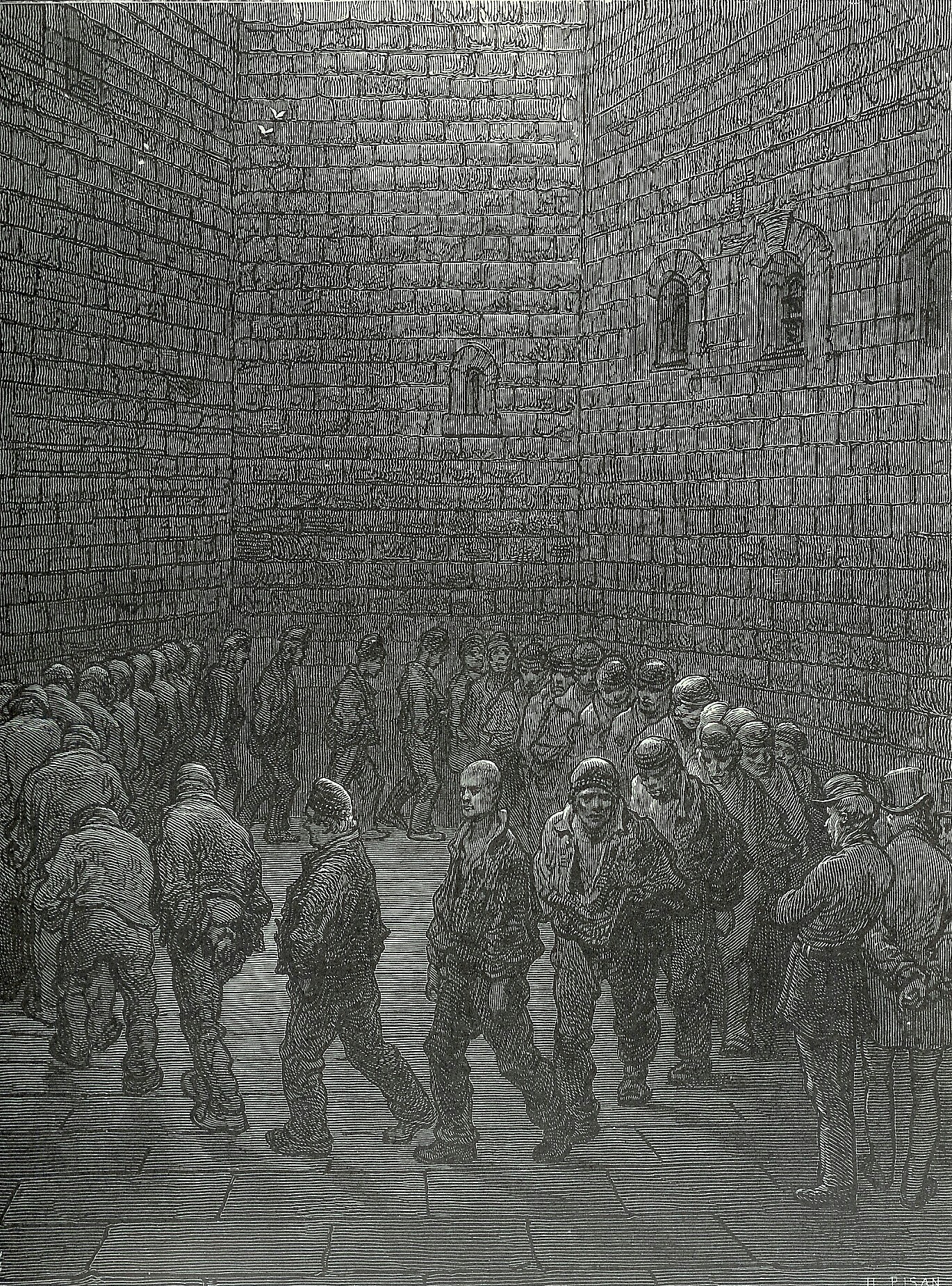 귀스타브 도레가 1872년에 그린 뉴게이트 교도소 운동장 그림을 보면 당시의 열악한 환경을 짐작할 수 있다.뉴게이트 교도소는 죄수들을 족쇄에 채워 범죄에 따라 다른 감옥으로 보냈고, 사형수는 족쇄와 쇠사슬이 늘어선 열린 하수구와 같은 지하실에 갇혔다. 일반 채무자들은 "돌 홀", 일반 흉악범들은 "돌 감옥"으로 보내졌는데, 감옥은 더럽고 빛이 없어 의사조차 들어가길 꺼릴 정도였다.[5] 죄수들은 술에 취해 있었고, 이가 들끓었으며, 간수들은 죄수들을 굶주리게 내버려 두었다.[5] 1315년부터 1316년까지 뉴게이트에서 62명의 사망자가 검시관의 조사를 받았다.[5]