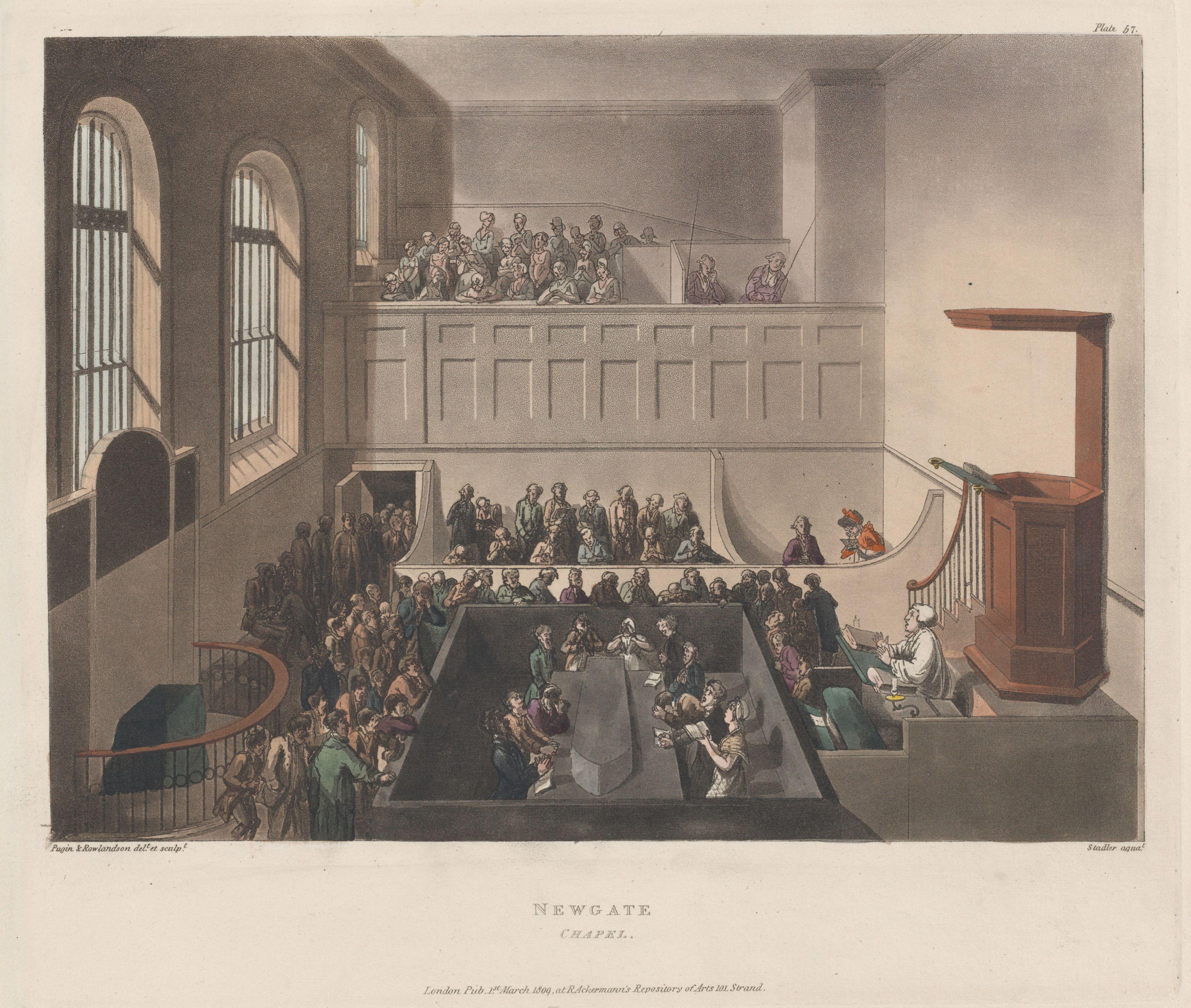 1783년, 런던의 교수형 집행 장소가 타이번에서 뉴게이트로 옮겨졌다.[17] 런던의 주요 감옥이 된 이곳 밖에서 공개 처형이 이루어졌고, 여전히 많은 인파가 몰려들었다. 런던 시장이나 보안관에게 허가를 받아 감옥을 방문하는 것도 가능했다. 사형수는 두꺼운 벽으로 뉴게이트 가와 분리된 좁고 음침한 감방에 갇혔으며, 내부 안뜰에서 희미한 빛만이 들어왔다. 교수대는 뉴게이트 가의 문 밖에 설치되어 일반인들이 볼 수 있도록 했다. 수천 명의 인파가 거리에 모여 이 처형을 지켜봤으며, 1807년에는 4만 명의 관중 중 일부가 붕괴되어 수십 명이 사망하는 1807년 뉴게이트 참사가 발생했다.[18]4. 2. 공개 처형과 중단