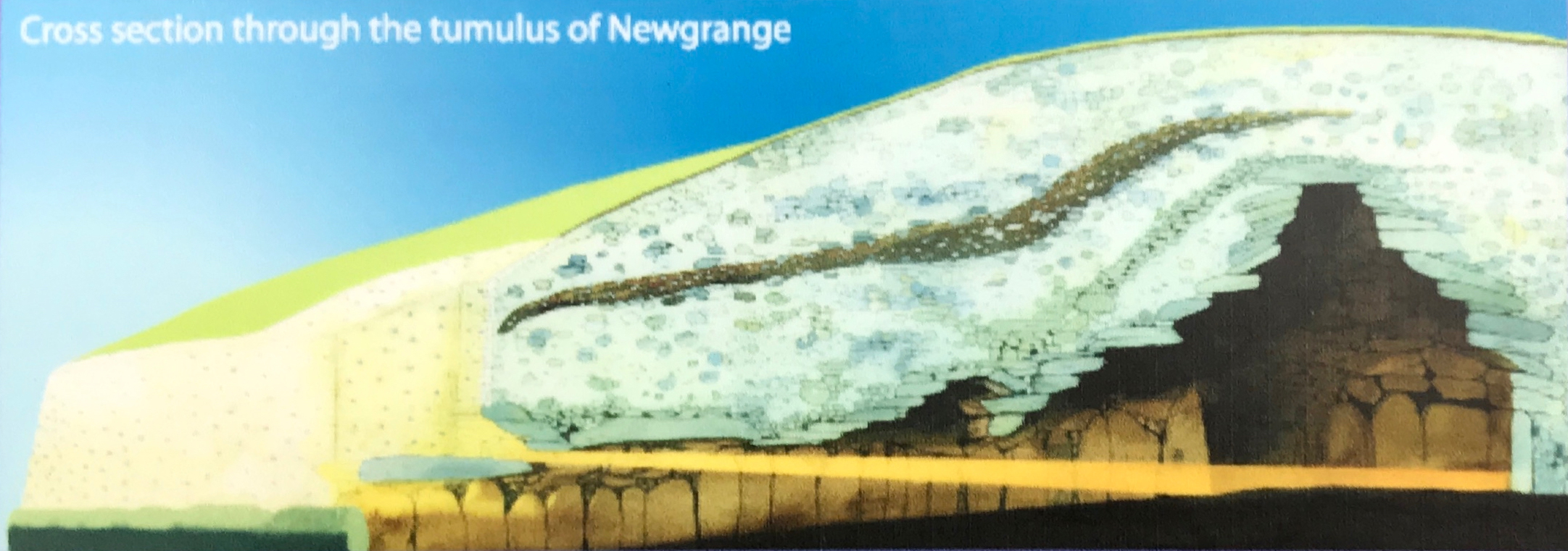 이 통로는 19미터(60피트)[11], 즉 구조물 중앙까지 약 3분의 1 정도 뻗어 있다. 통로 끝에는 높은 코벨 아치 천장을 가진 더 큰 중앙 석실에서 세 개의 작은 석실이 나온다. 각 작은 석실에는 큰 평평한 "분지석"이 있으며, 선사 시대에 사망자의 뼈가 놓였을 수 있다. 매장지였는지는 여전히 불분명하다. 이 통로의 벽은 오르토스탯이라고 하는 큰 돌판으로 만들어졌으며, 서쪽에는 22개, 동쪽에는 21개가 있다. 평균 높이는 1.5미터이다.[12] 여러 개에는 조각(재발견 이후 시대의 낙서 포함)이 새겨져 있다. 오르토스탯은 언덕 경사면에 건설된 통로가 약간 경사진 결과로 통로 안쪽으로 갈수록 높이가 낮아진다.[13] 천장에는 연기의 흔적이 없다. 묘실로 추정되는 방의 지붕은 코인 아치 형태이며, 최고 지점은 바닥에서 6미터 높이이다. 지붕은 5000년 동안 그대로 유지되었고, 방수 기능도 유지되었다.