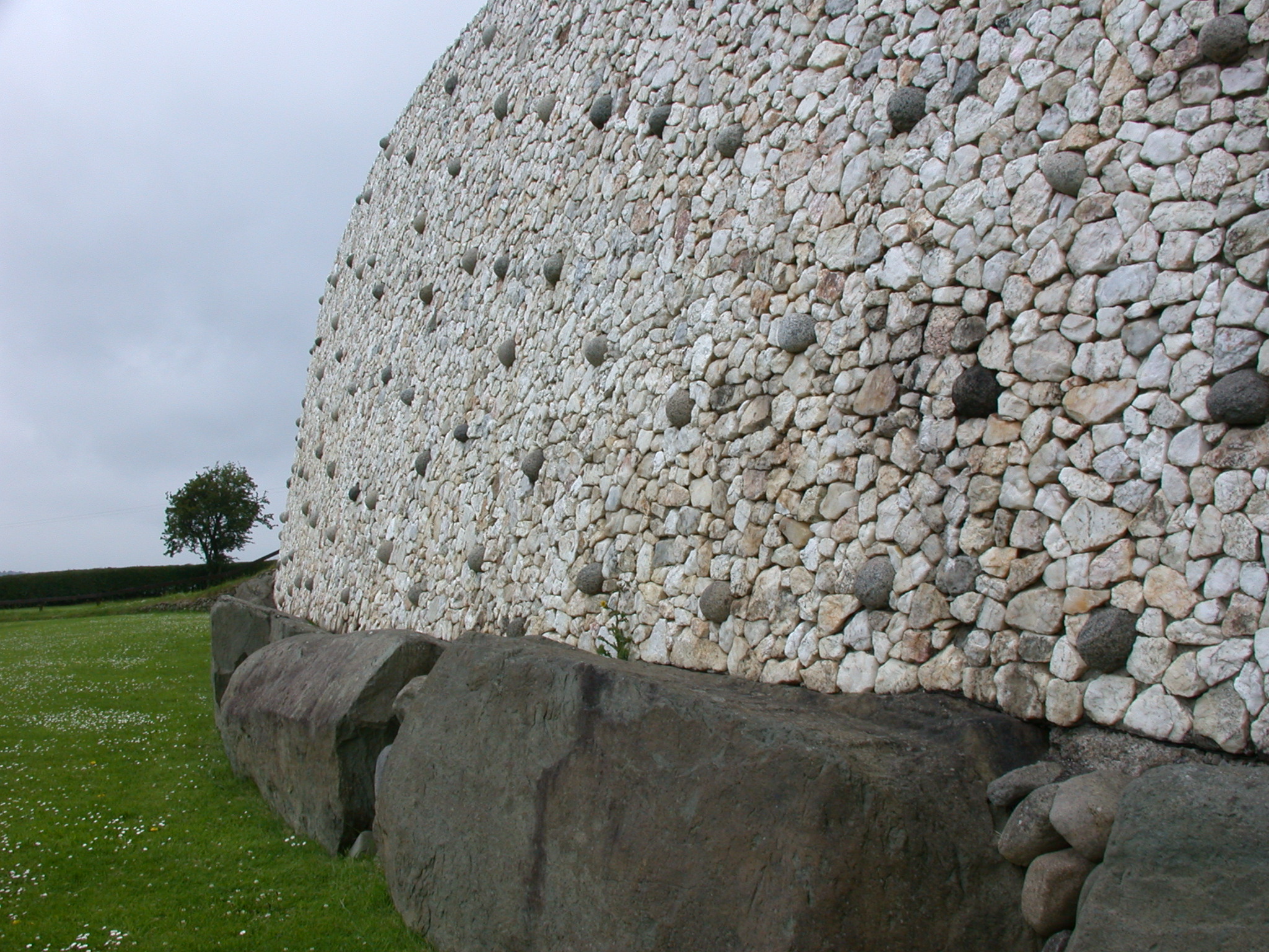 언덕 앞에는 회색 자갈과 섞인 두꺼운 흰색 석영 돌층이 발견되었다. 오켈리의 팀은 층위학을 주의 깊게 기록했다. 석영층은 경계석 근처에서 가장 두꺼웠고, 무너지거나 언덕에서 바깥쪽으로 기울어진 경계석 아래에서는 발견되지 않았다. 이는 석영이 경계석 위에서 떨어지거나 미끄러져 내려왔다는 것을 나타낸다. 오켈리는 석영이 유적 앞면의 흰색 외벽 또는 외피를 구성했을 것이라고 결론지었다.[67] 고고학자들은 또한 언덕 뒤쪽의 세 개의 경계석 위에 여전히 제자리에 있는 외피의 바닥층으로 여겨지는 것을 발견했다.[68] 코크 대학교(University College Cork)의 토목기술자인 존 포가티(John Fogarty)는 쌓인 느슨한 물질의 움직임 전문가로서 원래 외벽의 높이를 최대 3미터로 계산했다.[69] 포가티와 오켈리의 팀은 같은 종류의 석영과 자갈돌로 외벽을 만들고 무너뜨리는 실험을 통해 이론을 검증했다. 오켈리는 그 결과 층위학이 발굴에서 발견된 것과 거의 동일했다고 적었다.[70]