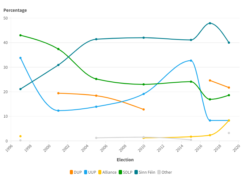 이후 1990년대 말부터 신 페인의 지지세가 두드러지기 시작하였다. 2001년 영국 총선에서는 득표율이 9.8% 증가하며 사회민주노동당의 시머스 맬런 의원과의 격차를 크게 줄였으며, 같은 날 치러진 지방선거에서는 사회민주노동당을 크게 누르고 승리하였다. 2003년 북아일랜드 의회 선거에서는 신 페인이 사회민주노동당으로부터 3석을 탈환하는 성과를 거뒀다.