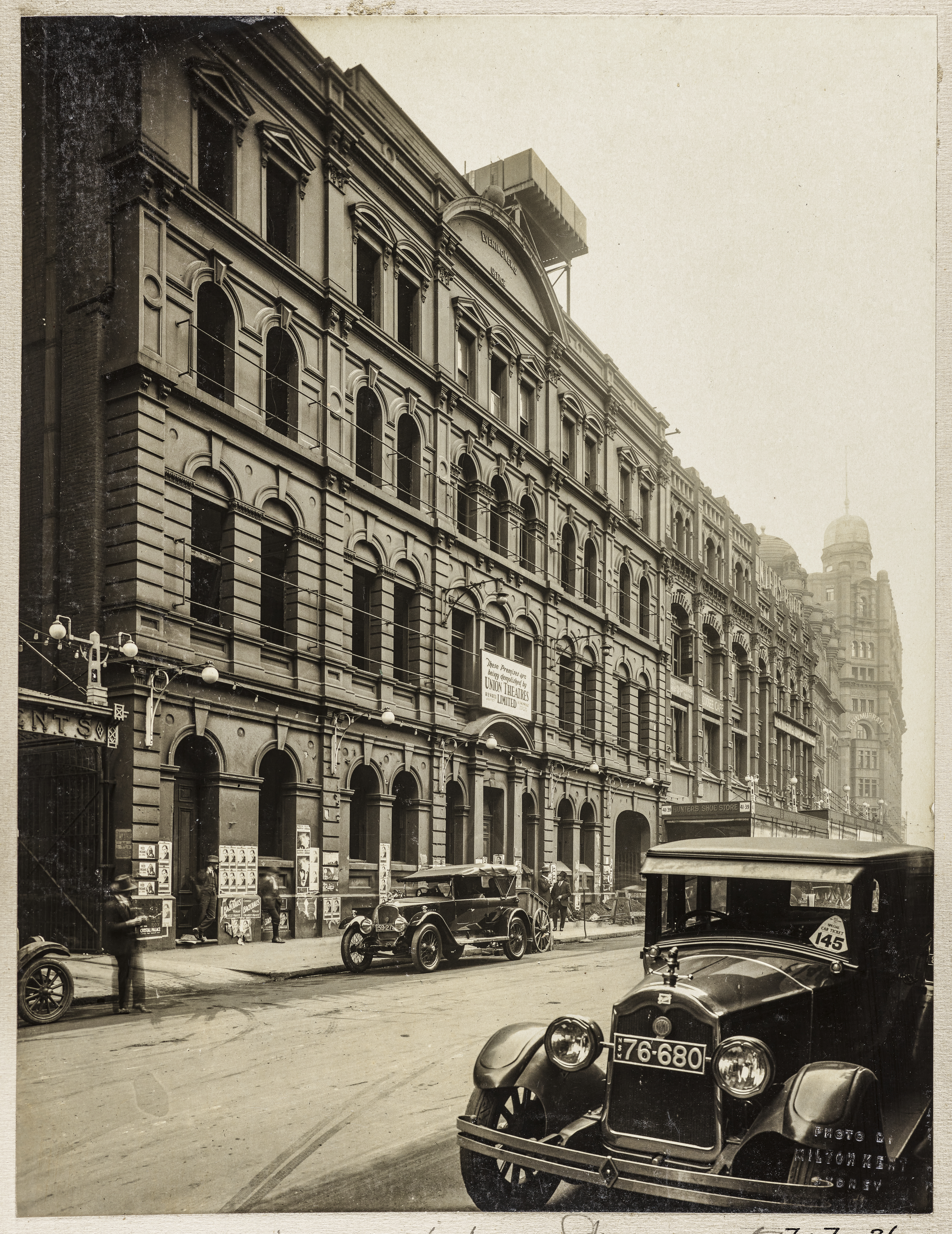 주립 극장을 위해 철거되기 전 47 마켓 스트리트에 있던 ''이브닝 뉴스'' 건물. 건물에 '이 건물은 유니온 극장 리미티드, HE 화이트 건축가, AJ 웨인라이트 철거 계약자에 의해 철거되고 있습니다'라는 표지판이 있다. 사진은 1926년 7월 7일 촬영, 출처: 시드니 시 기록보관소