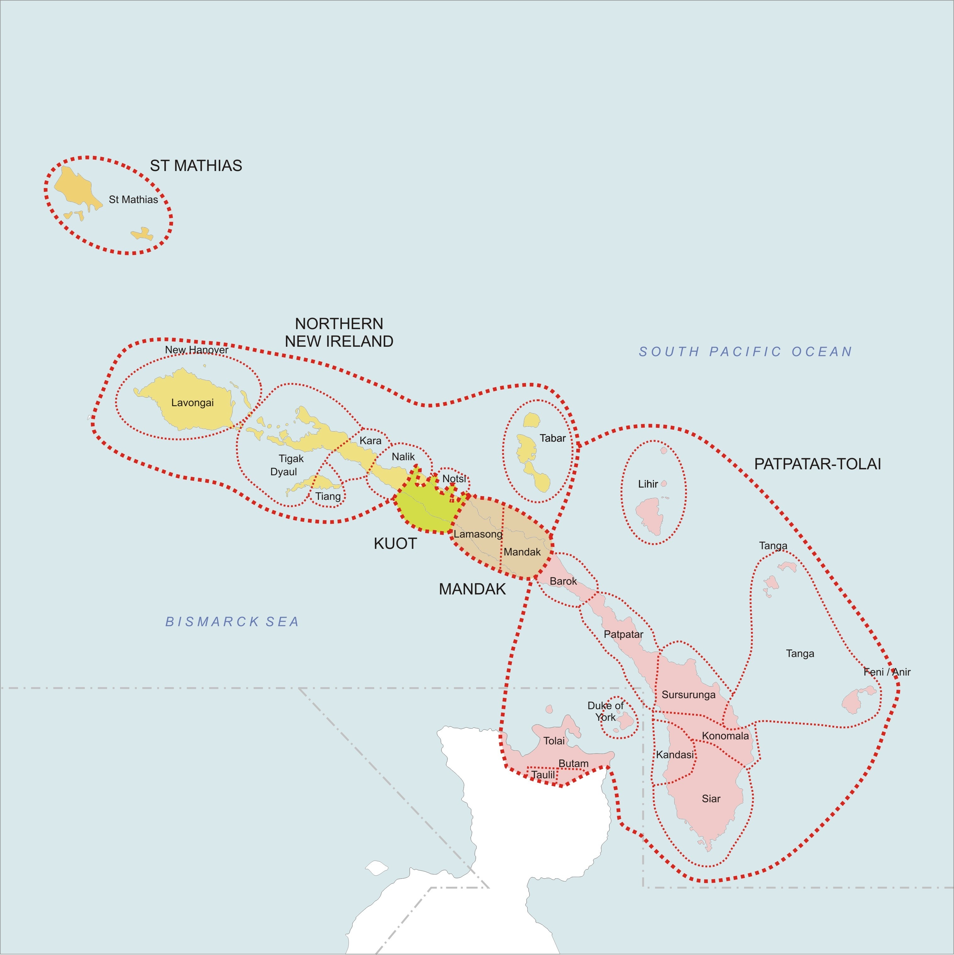 또한 뉴아일랜드섬 북부 일부에서는 오스트로네시아어 계통이 아닌 Kuot language|쿠오트어영어(별칭: 쿠오트어, 파나라스어) 사용자가 존재한다.